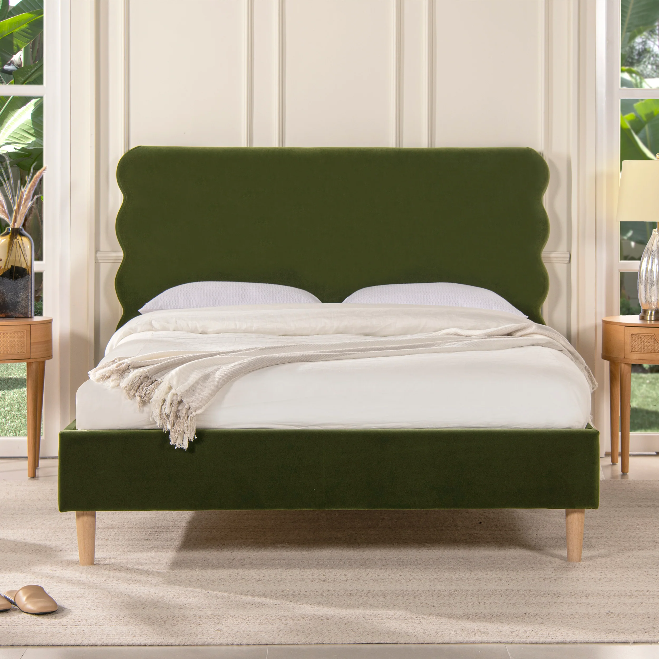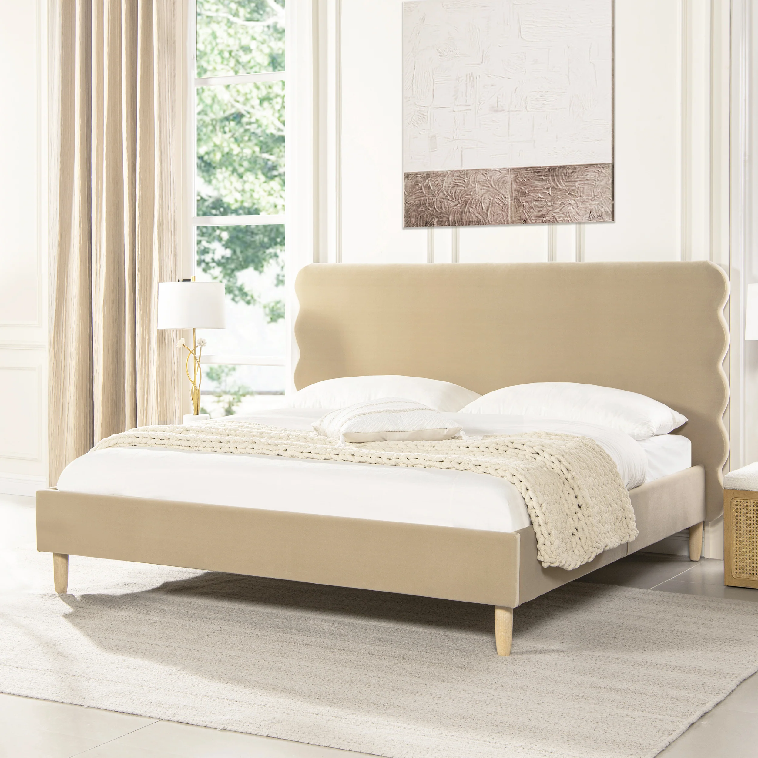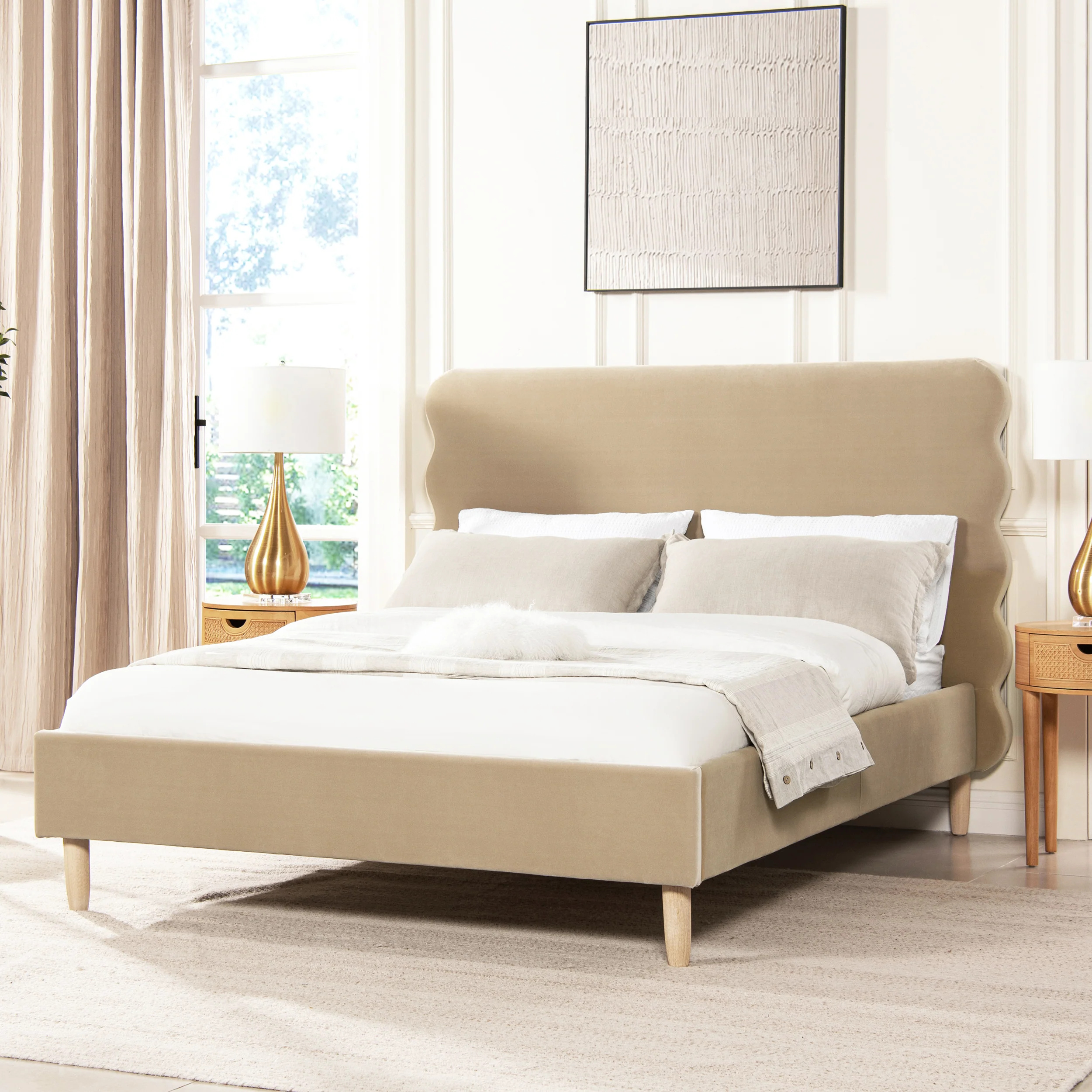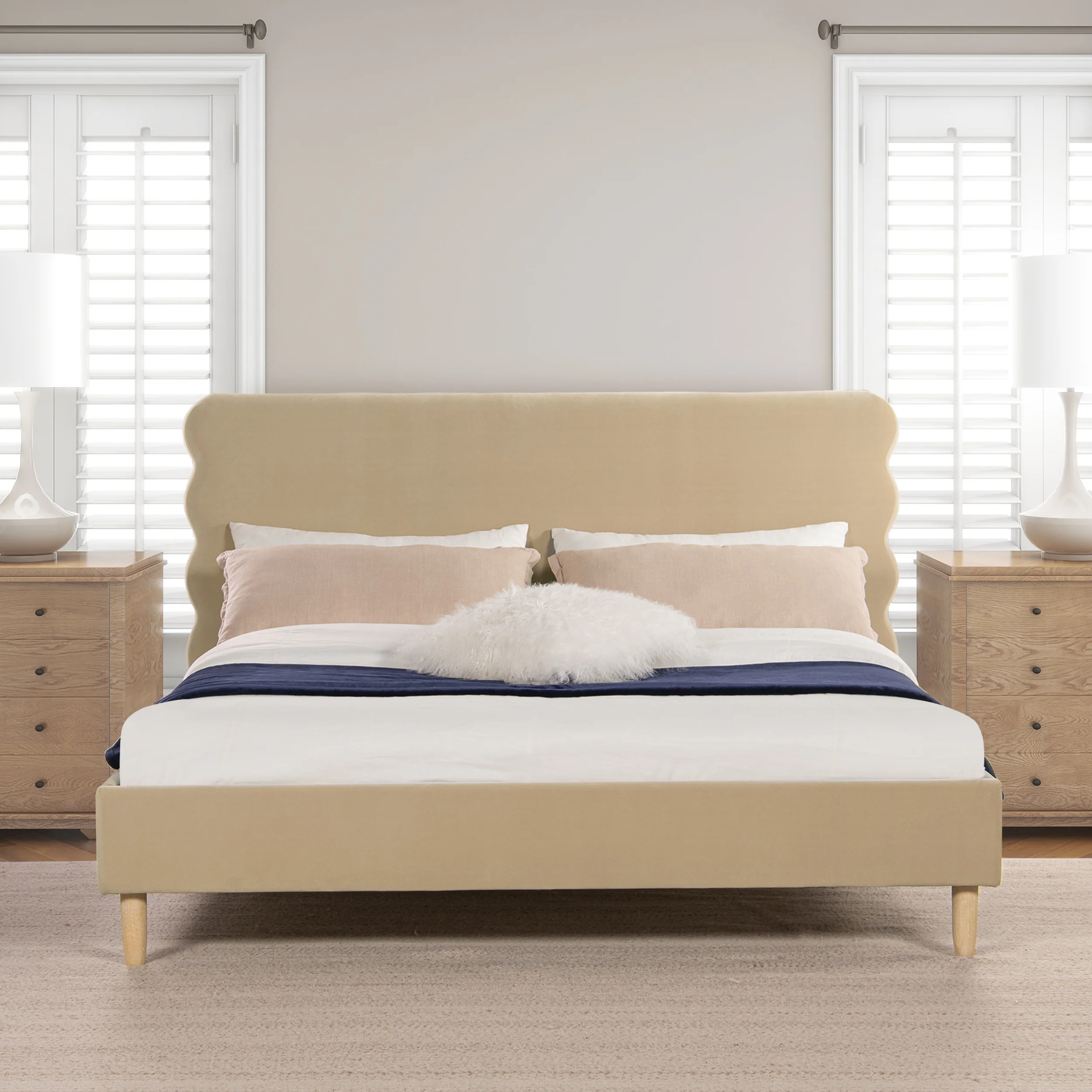 Essencee Upholstered Platform Bed with Wavy Headboard and Wood Legs