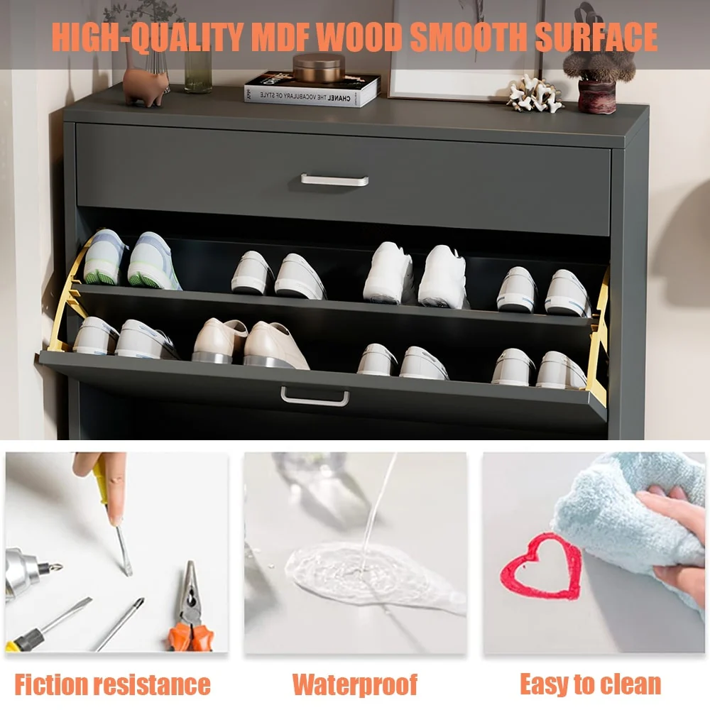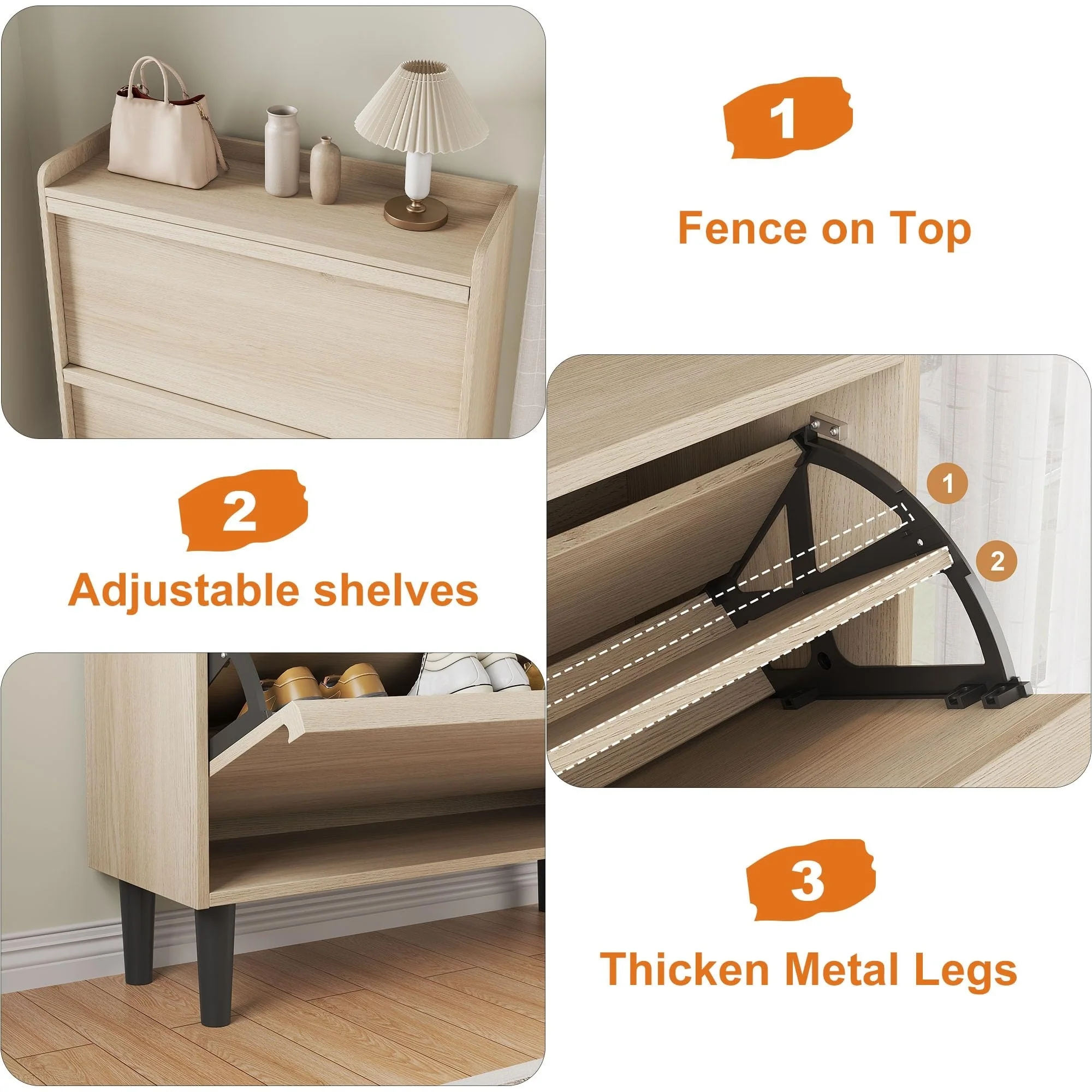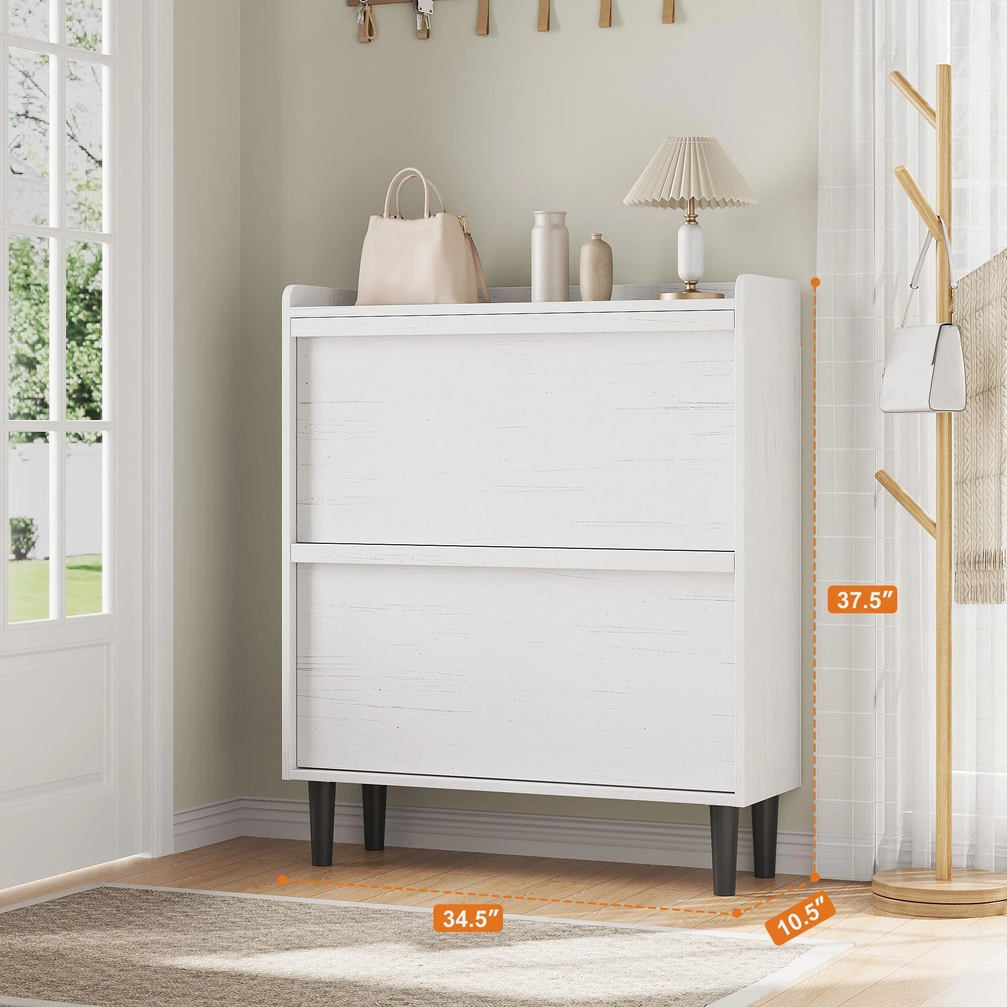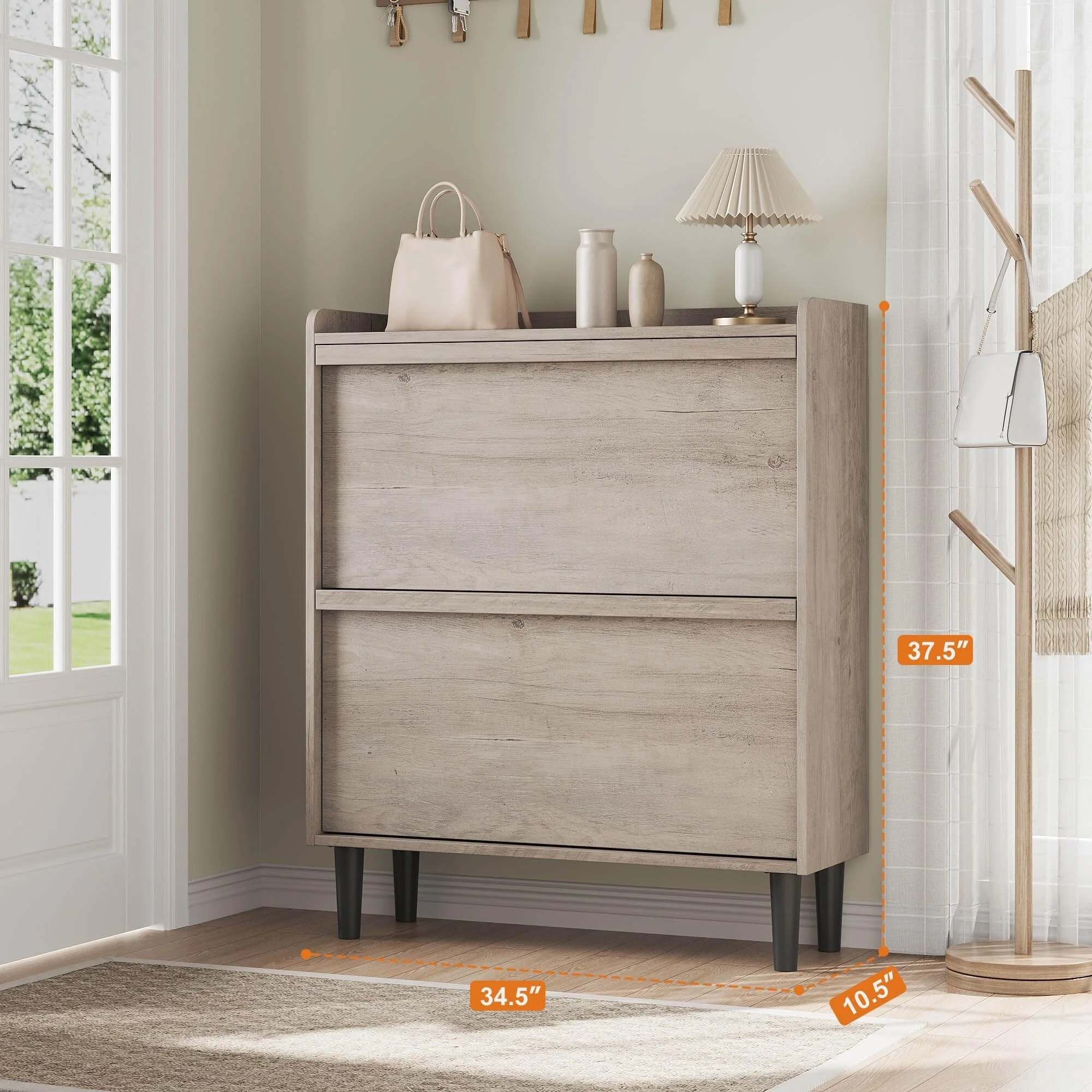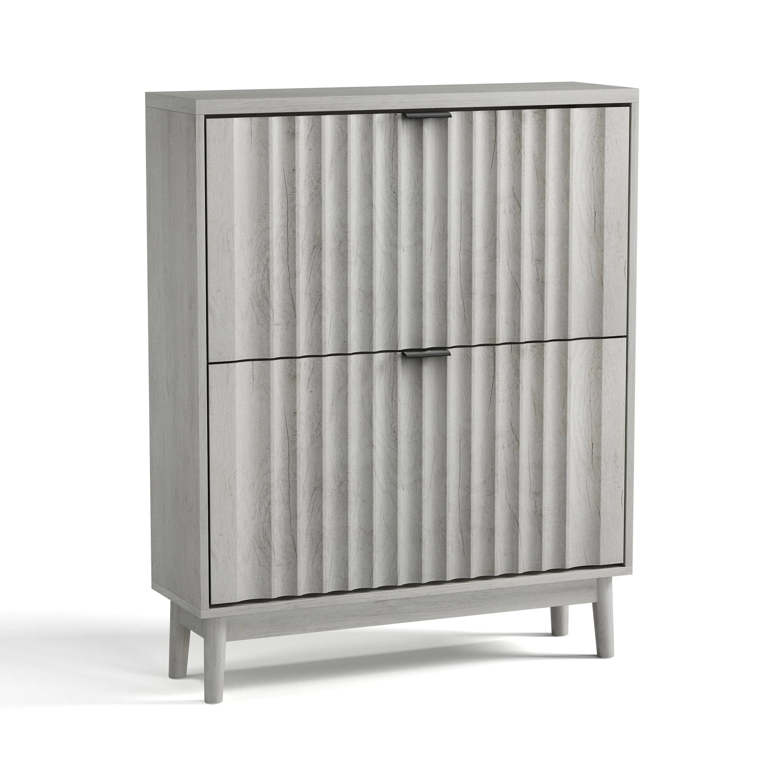 Fluted Shoe Cabinet for Entryway, Slim Shoe Storage Cabinet with 2 Flip Drawer and Solid Wood Legs Narrow Shoe Organizer