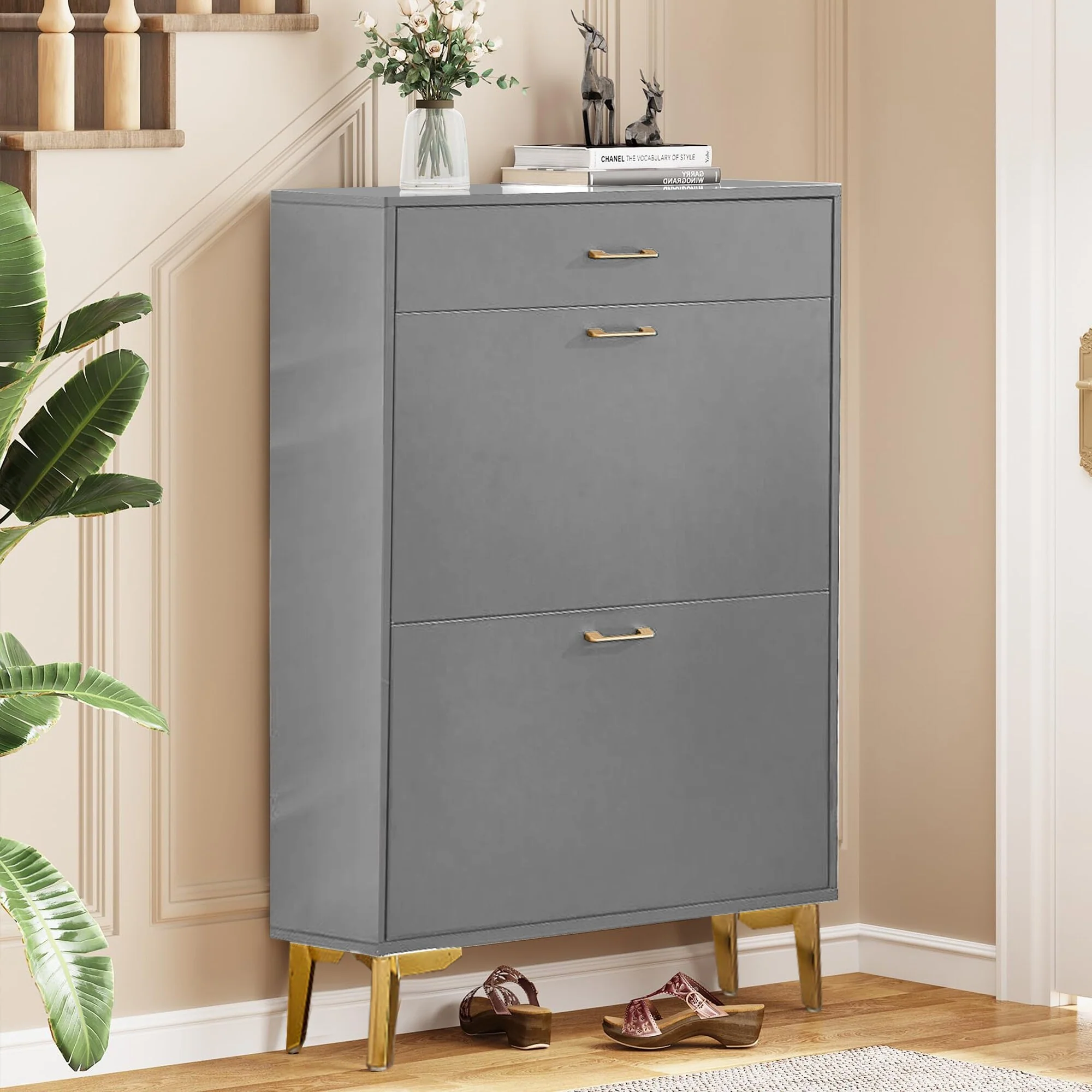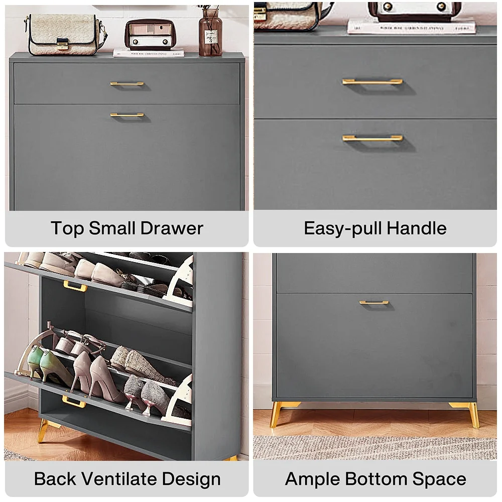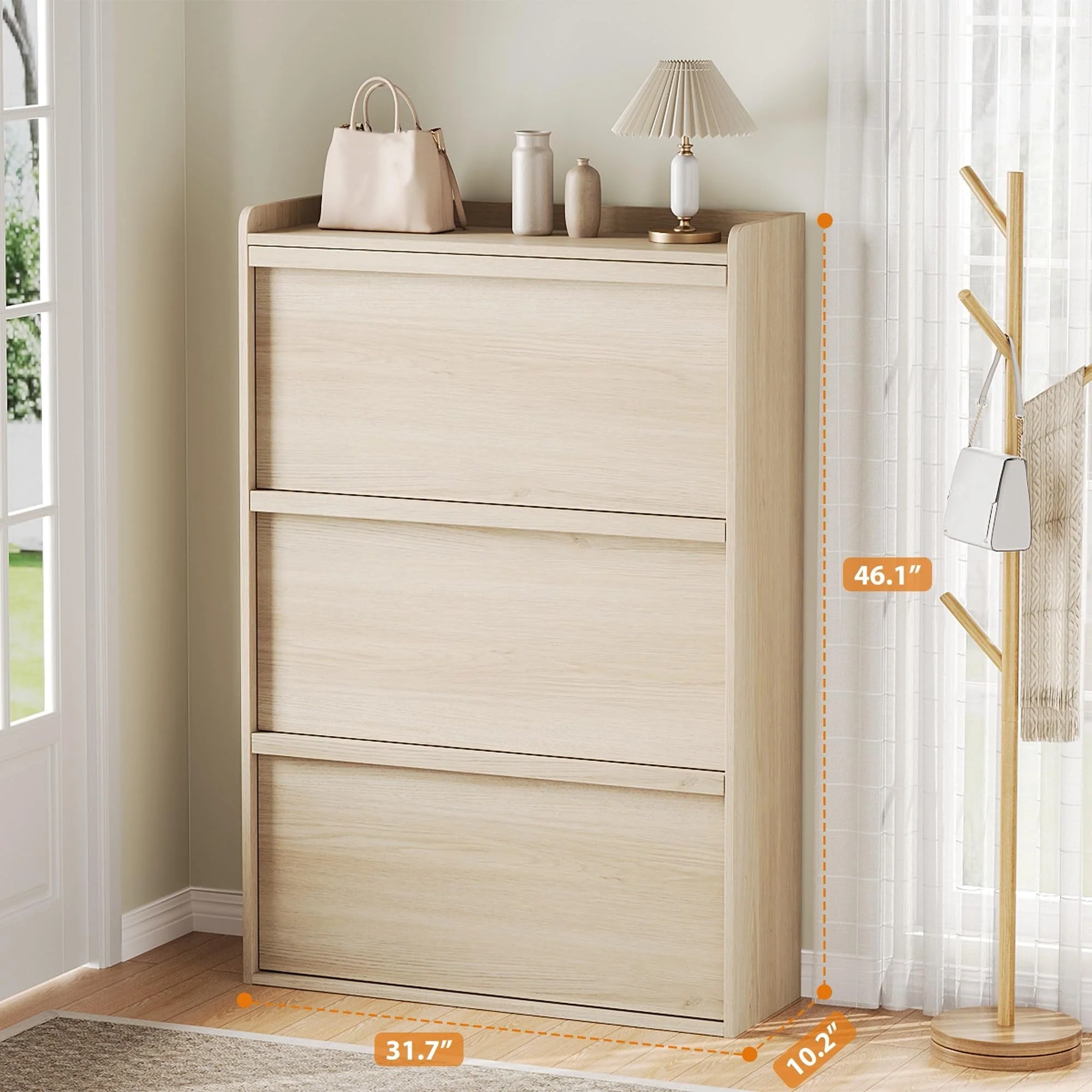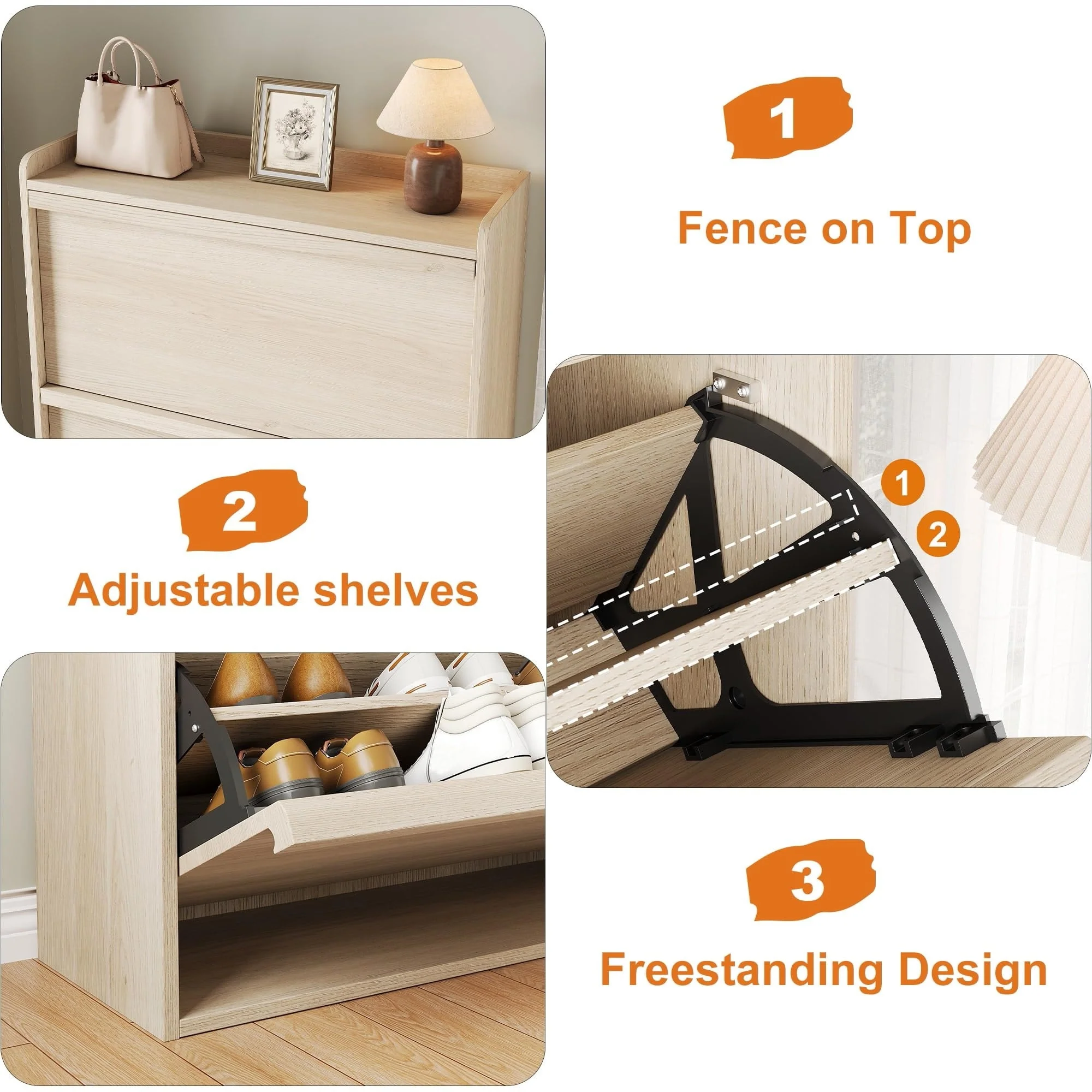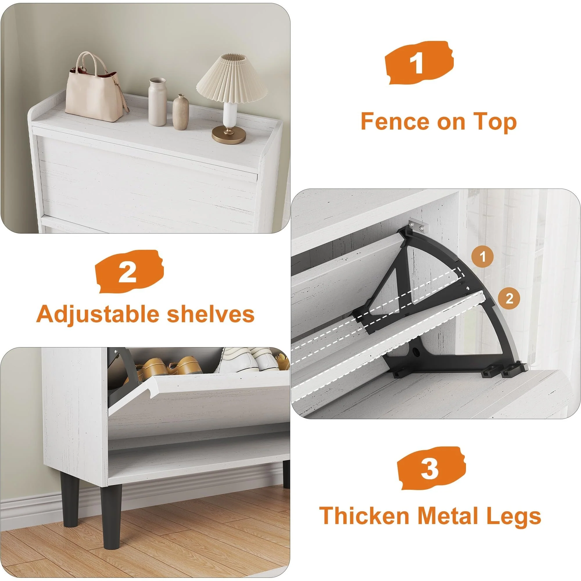 Fluted Shoe Cabinet for Entryway, Slim Shoe Storage Cabinet with 2 Flip Drawer and Solid Wood Legs Narrow Shoe Organizer