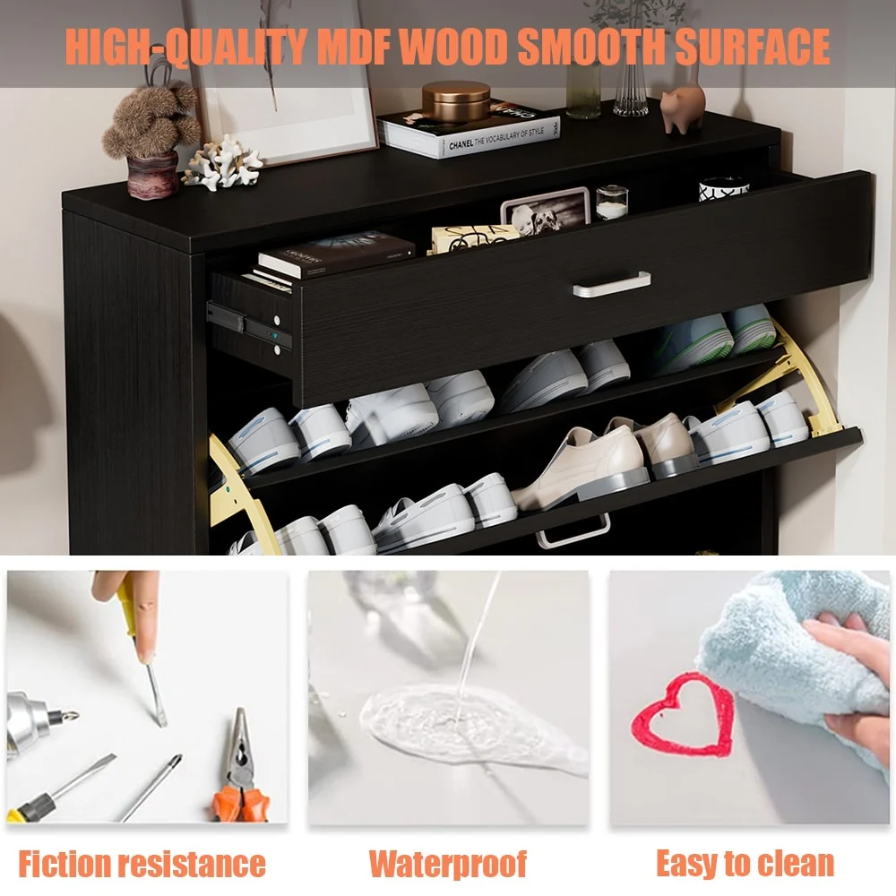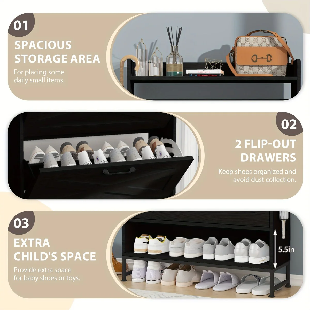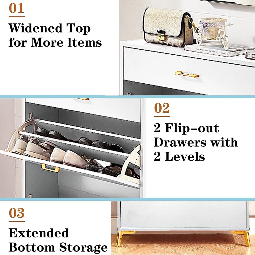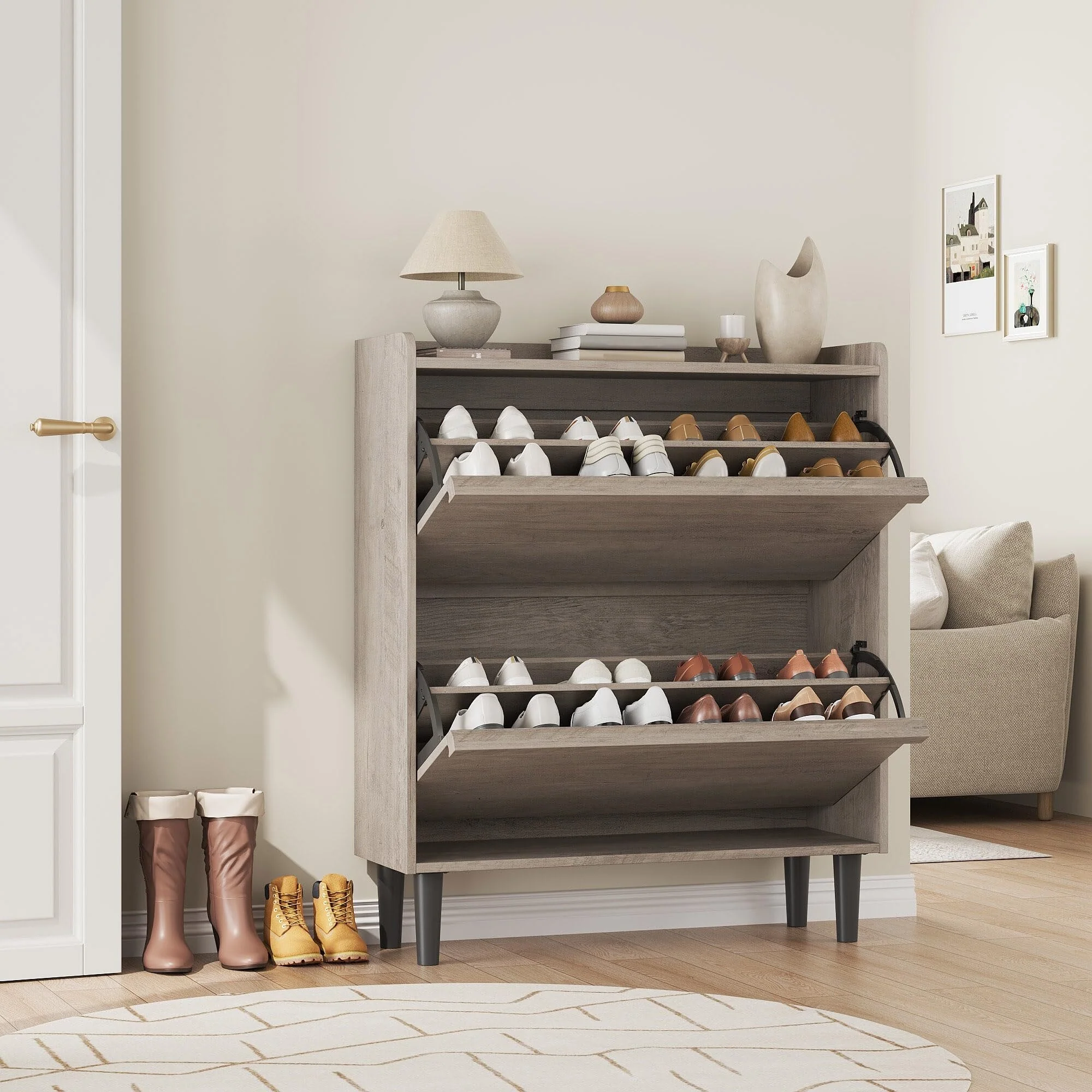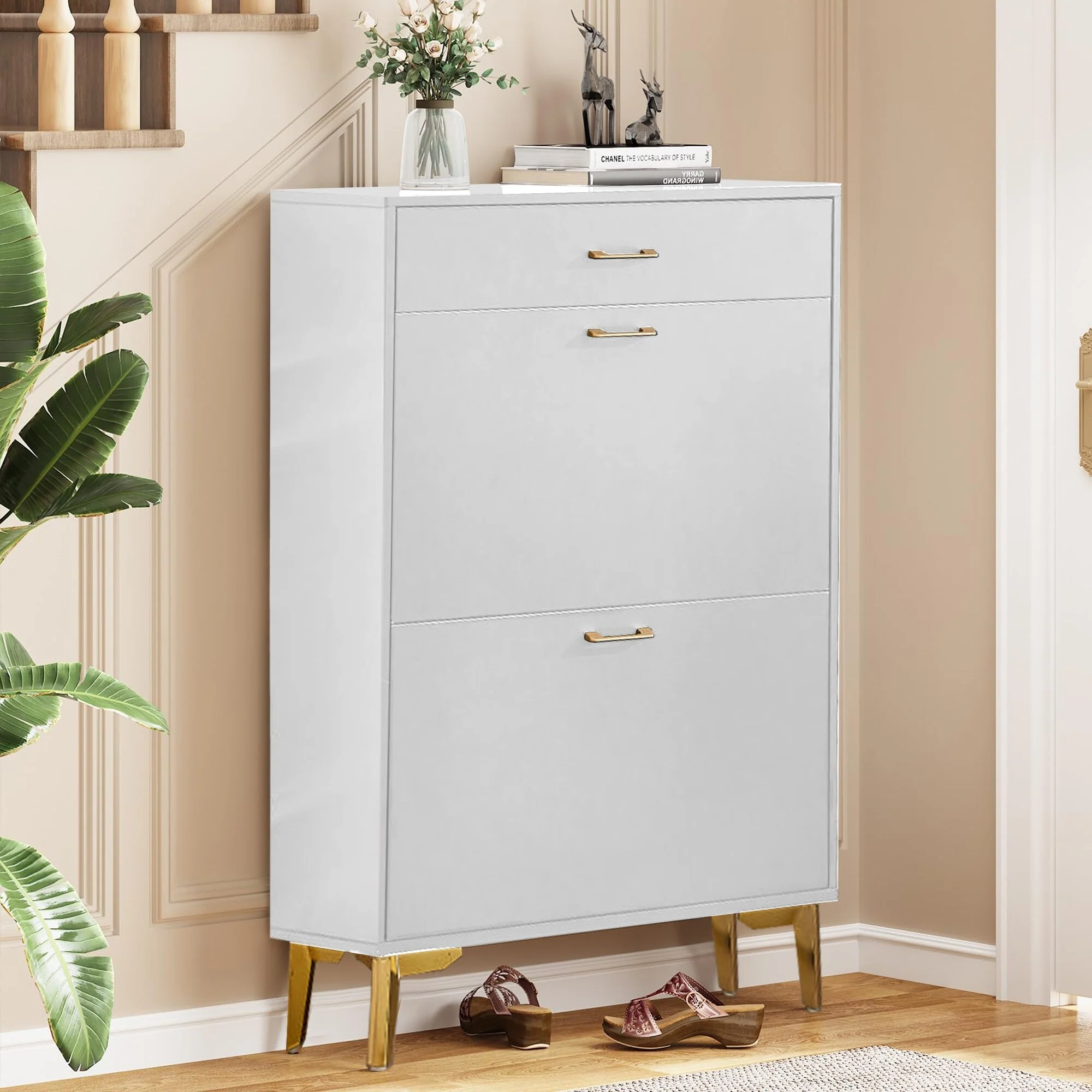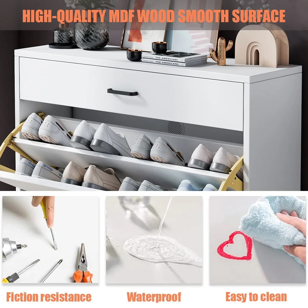 Fluted Shoe Cabinet for Entryway, Slim Shoe Storage Cabinet with 2 Flip Drawer and Solid Wood Legs Narrow Shoe Organizer