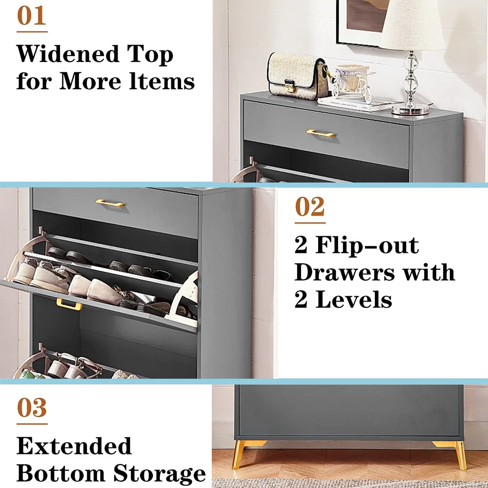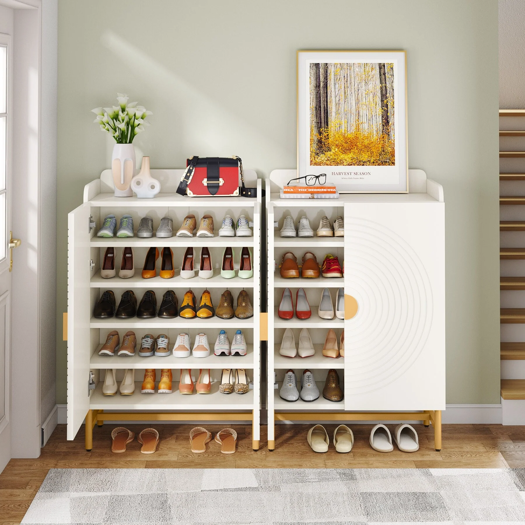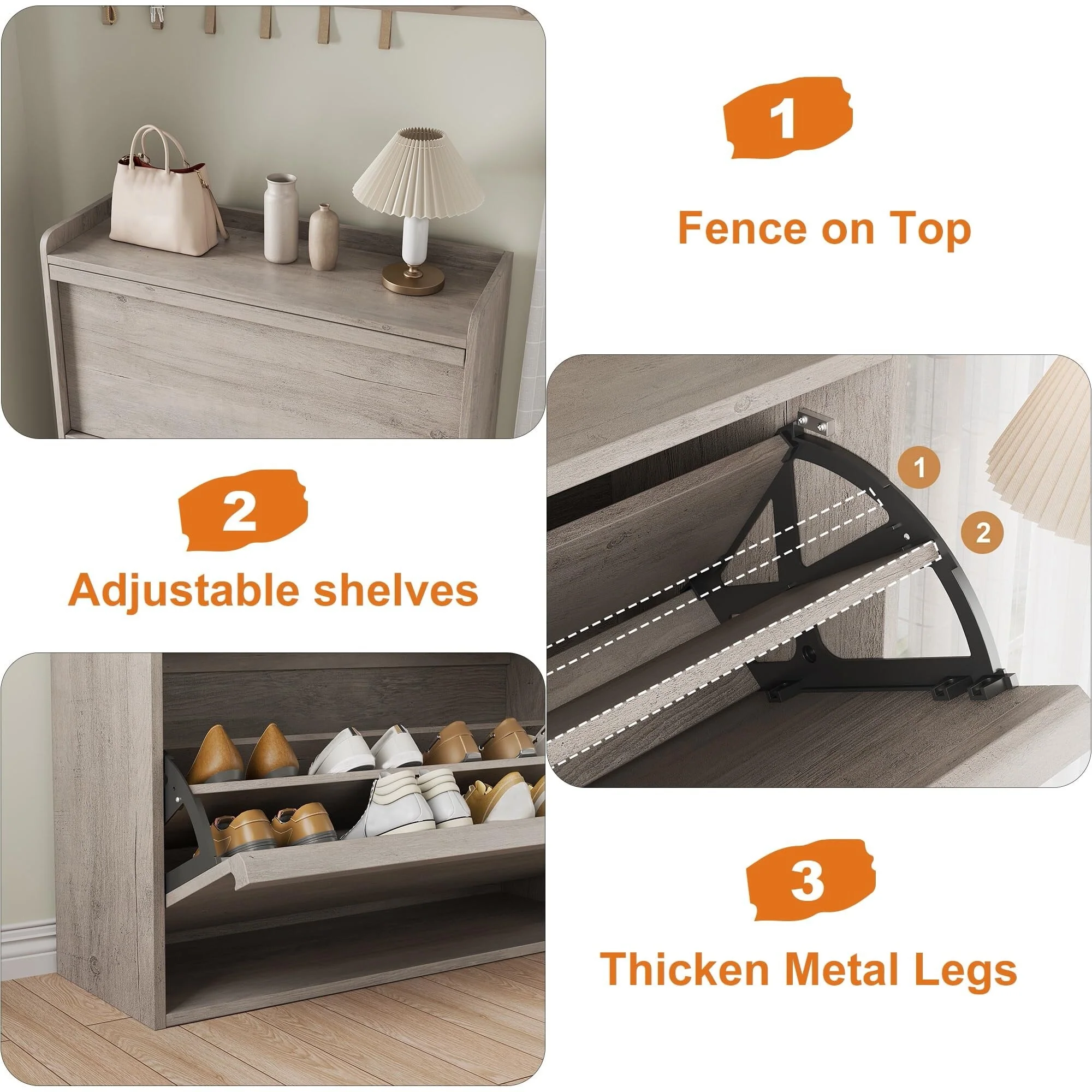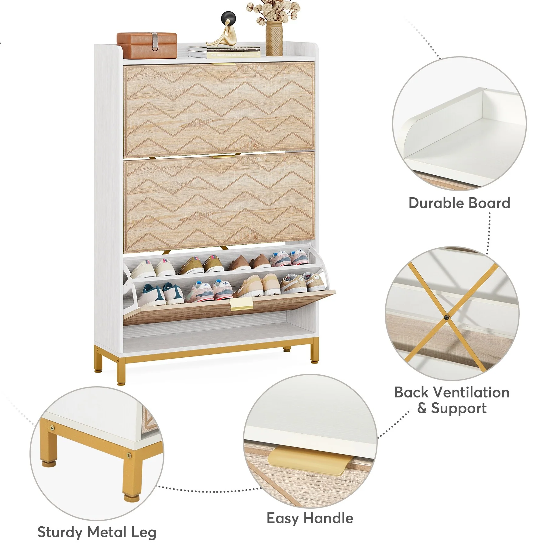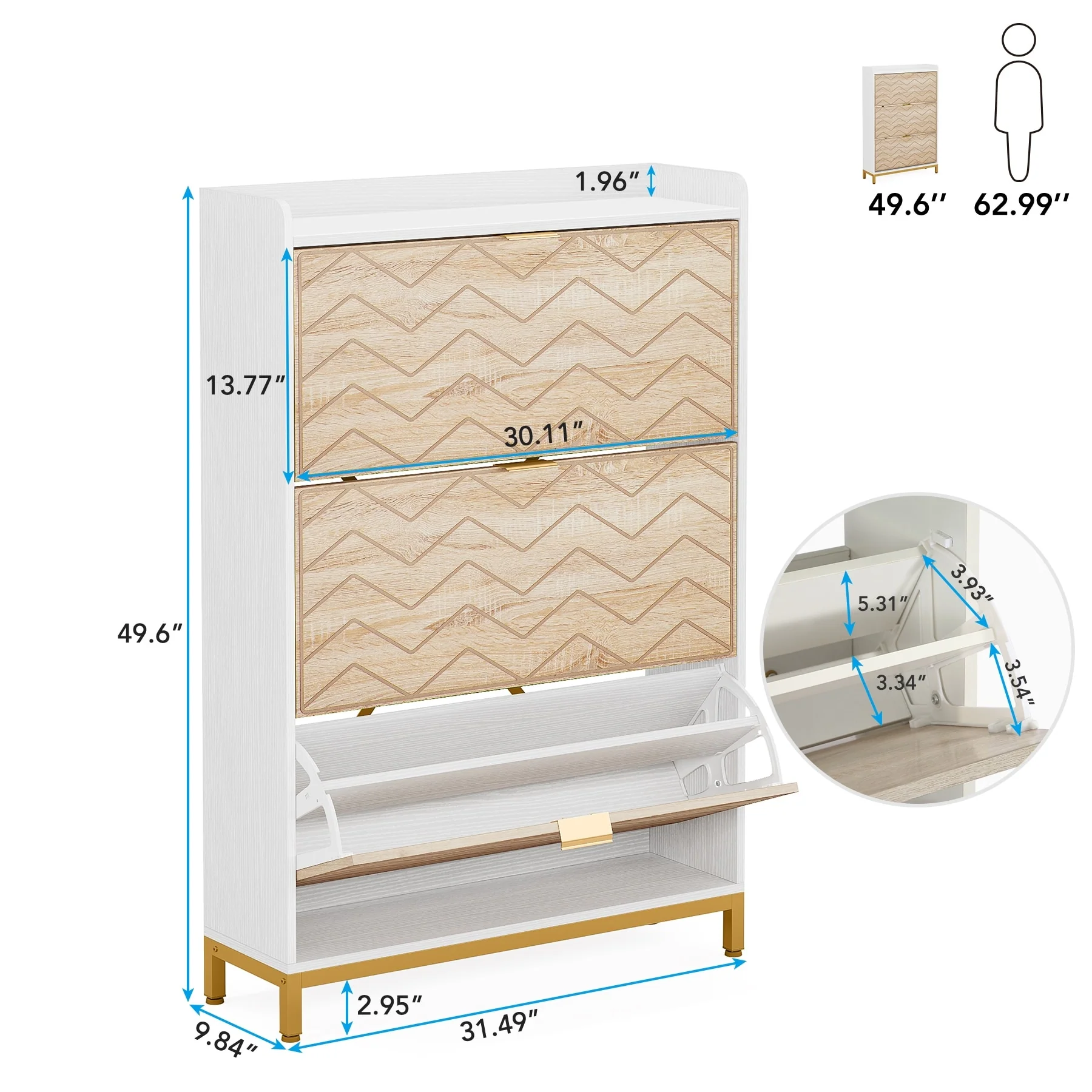 Fluted Shoe Cabinet for Entryway, Slim Shoe Storage Cabinet with 2 Flip Drawer and Solid Wood Legs Narrow Shoe Organizer