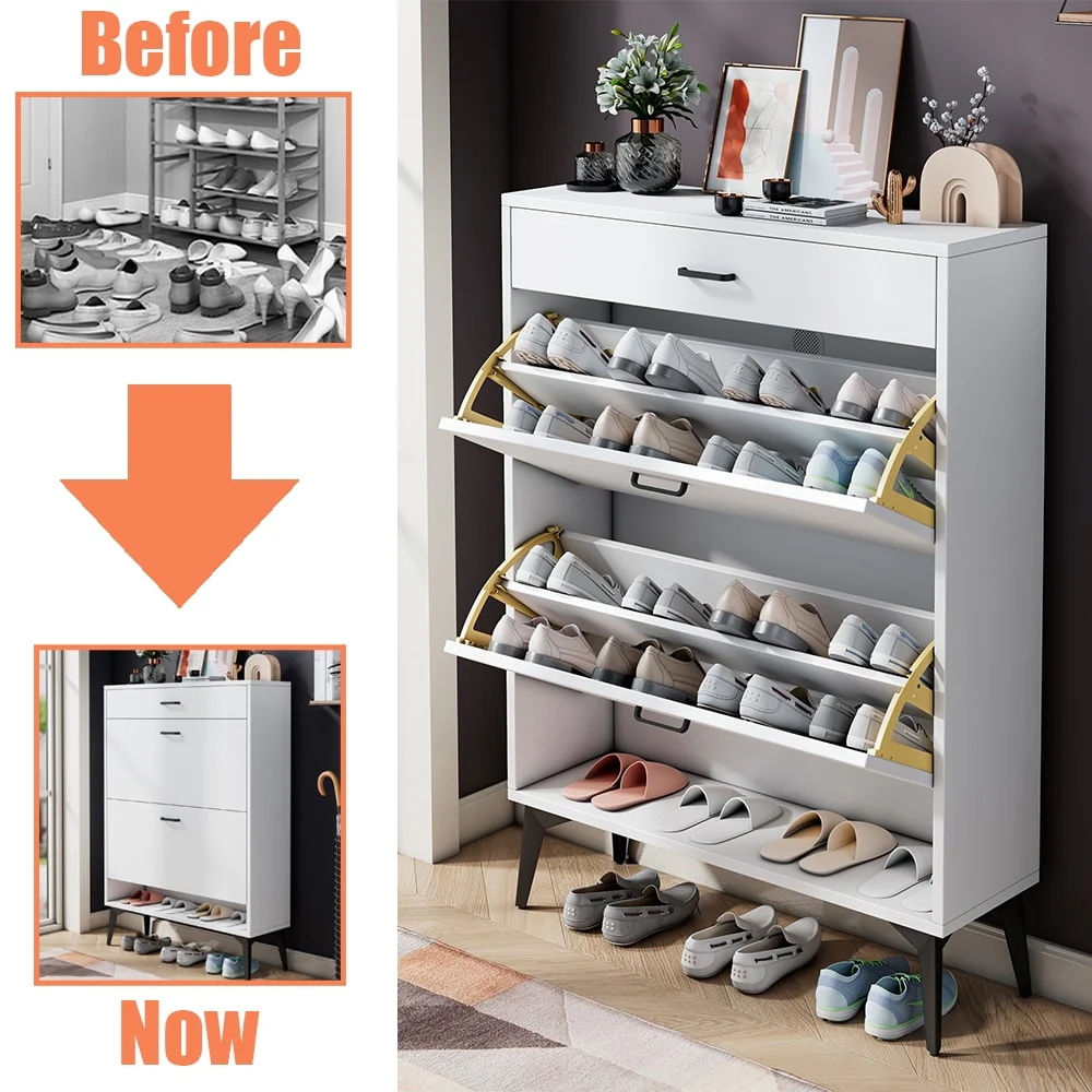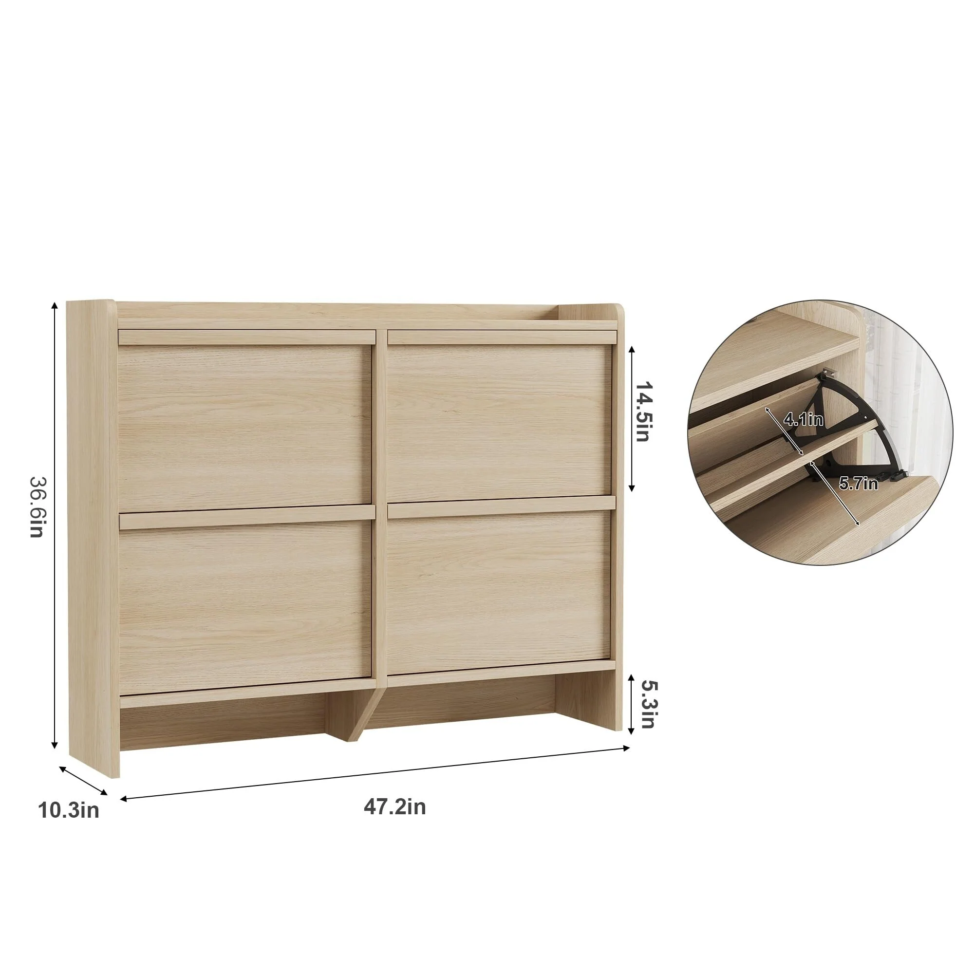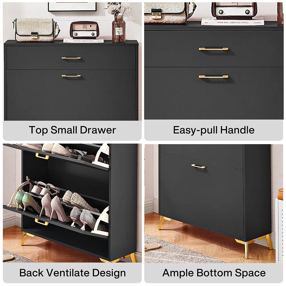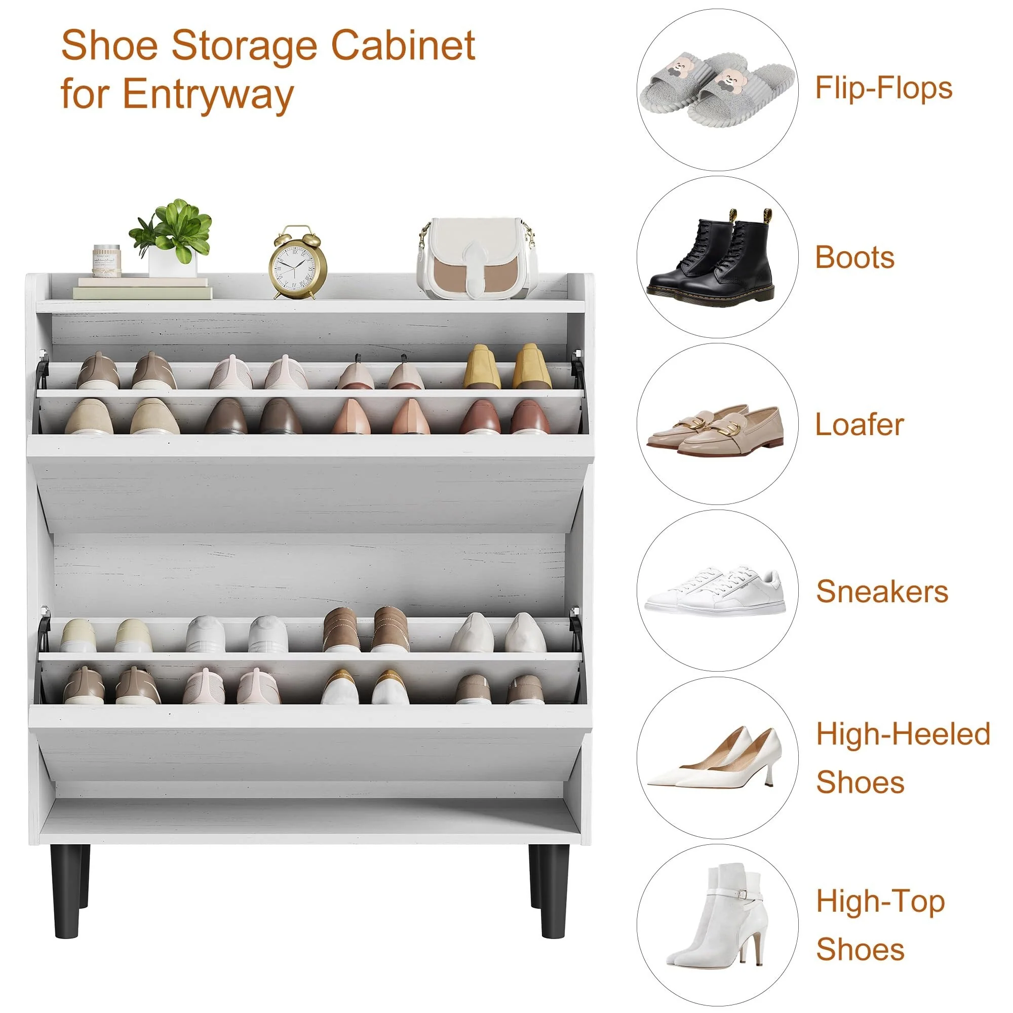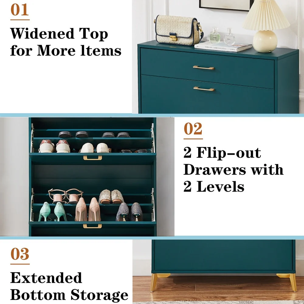 Fluted Shoe Cabinet for Entryway, Slim Shoe Storage Cabinet with 2 Flip Drawer and Solid Wood Legs Narrow Shoe Organizer