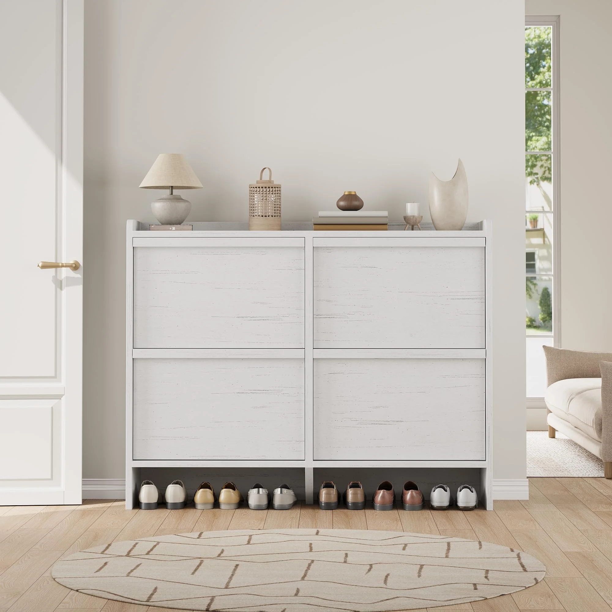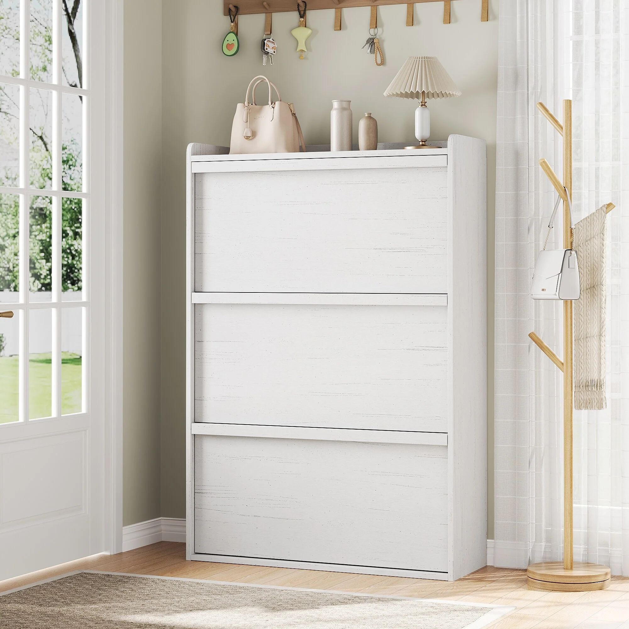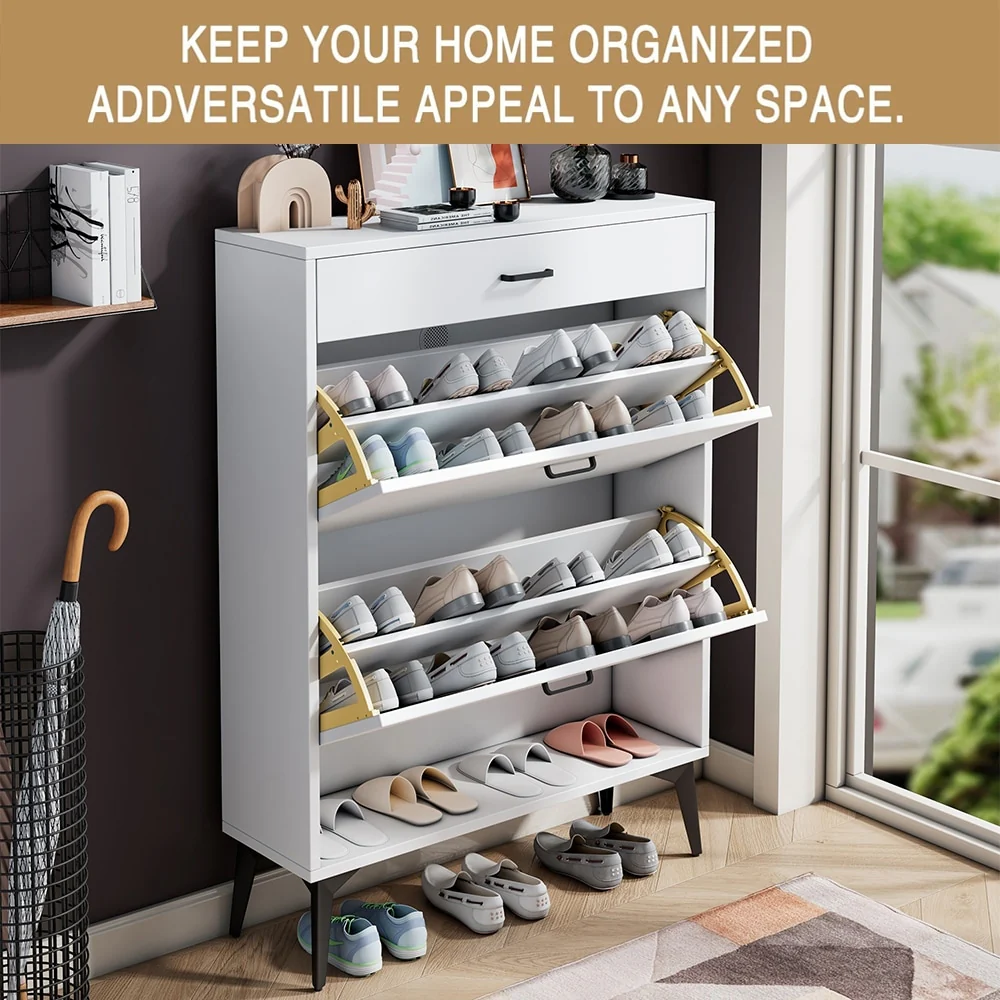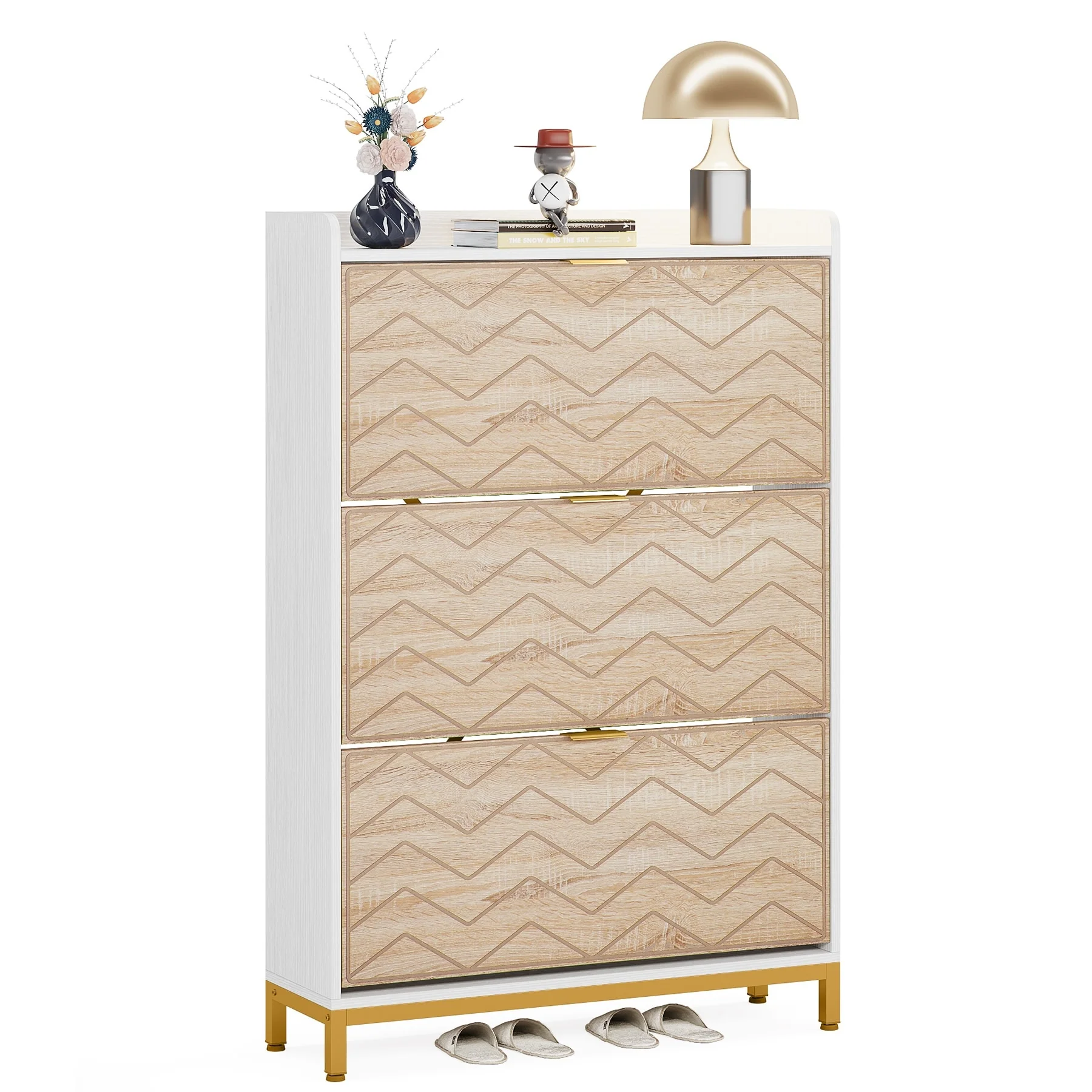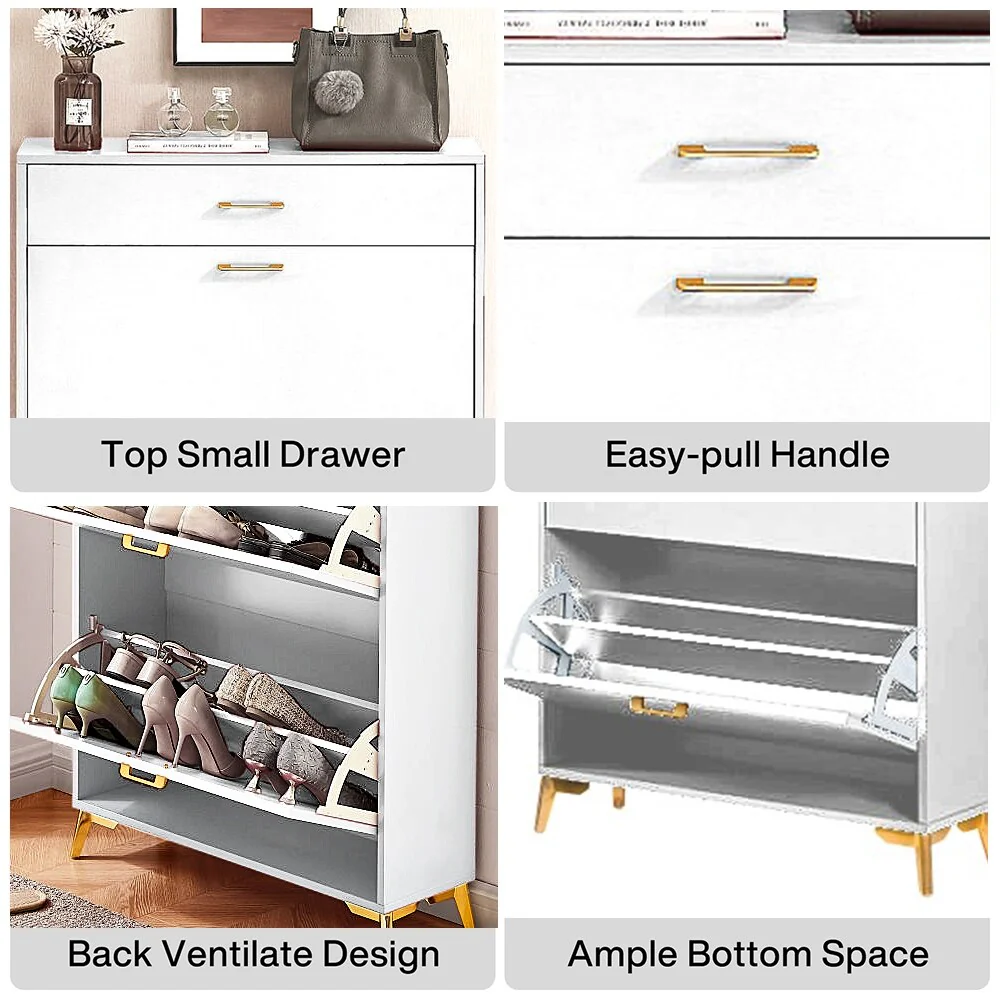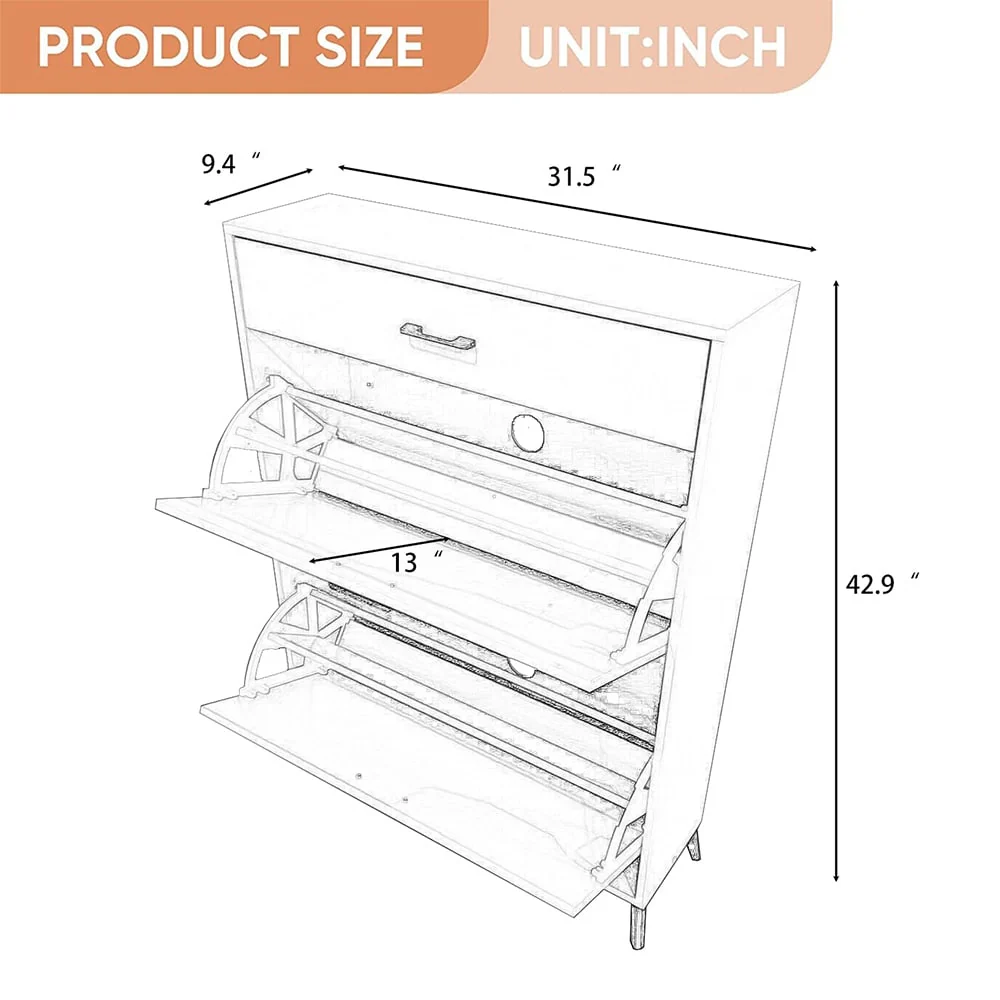Fluted Shoe Cabinet for Entryway, Slim Shoe Storage Cabinet with 2 Flip Drawer and Solid Wood Legs Narrow Shoe Organizer
