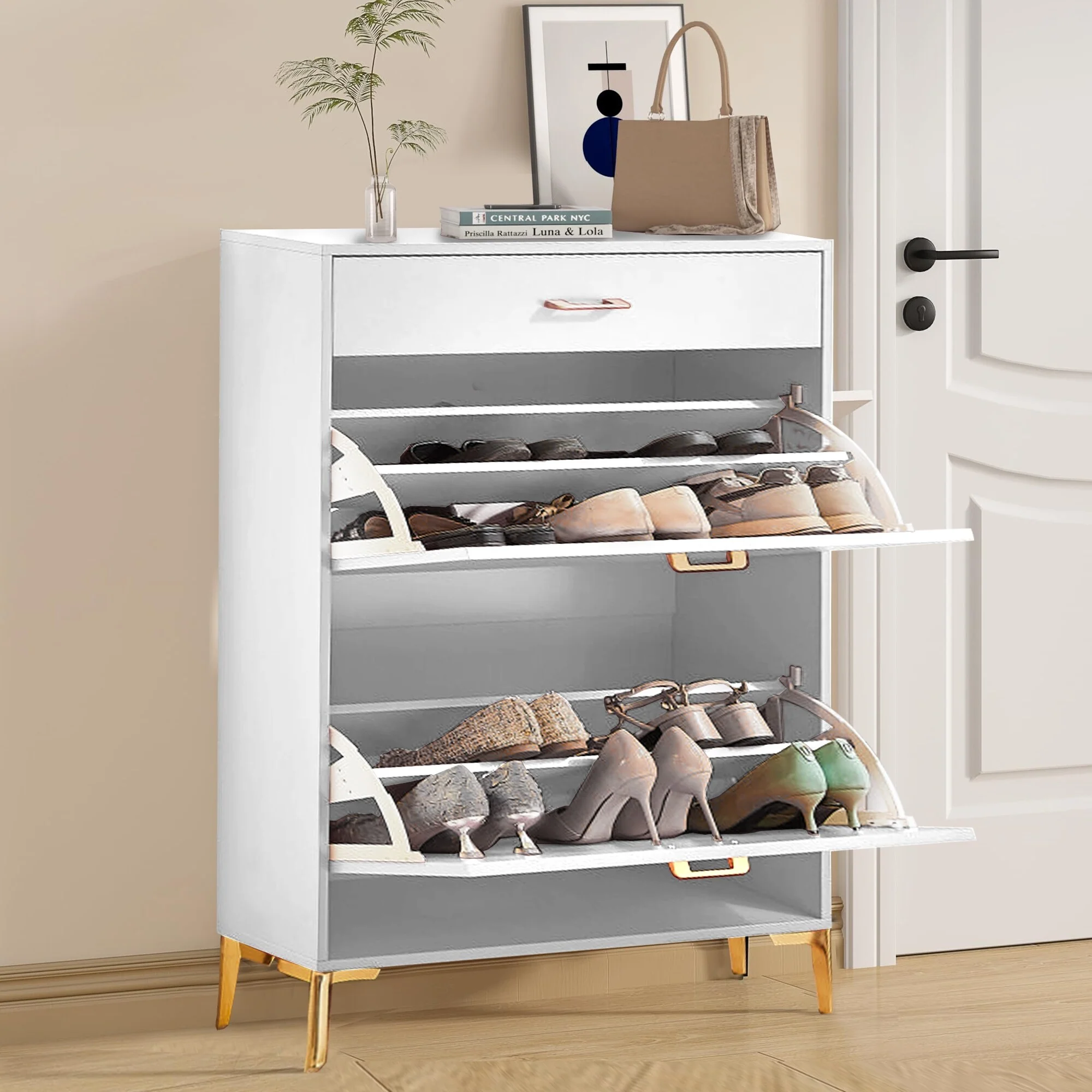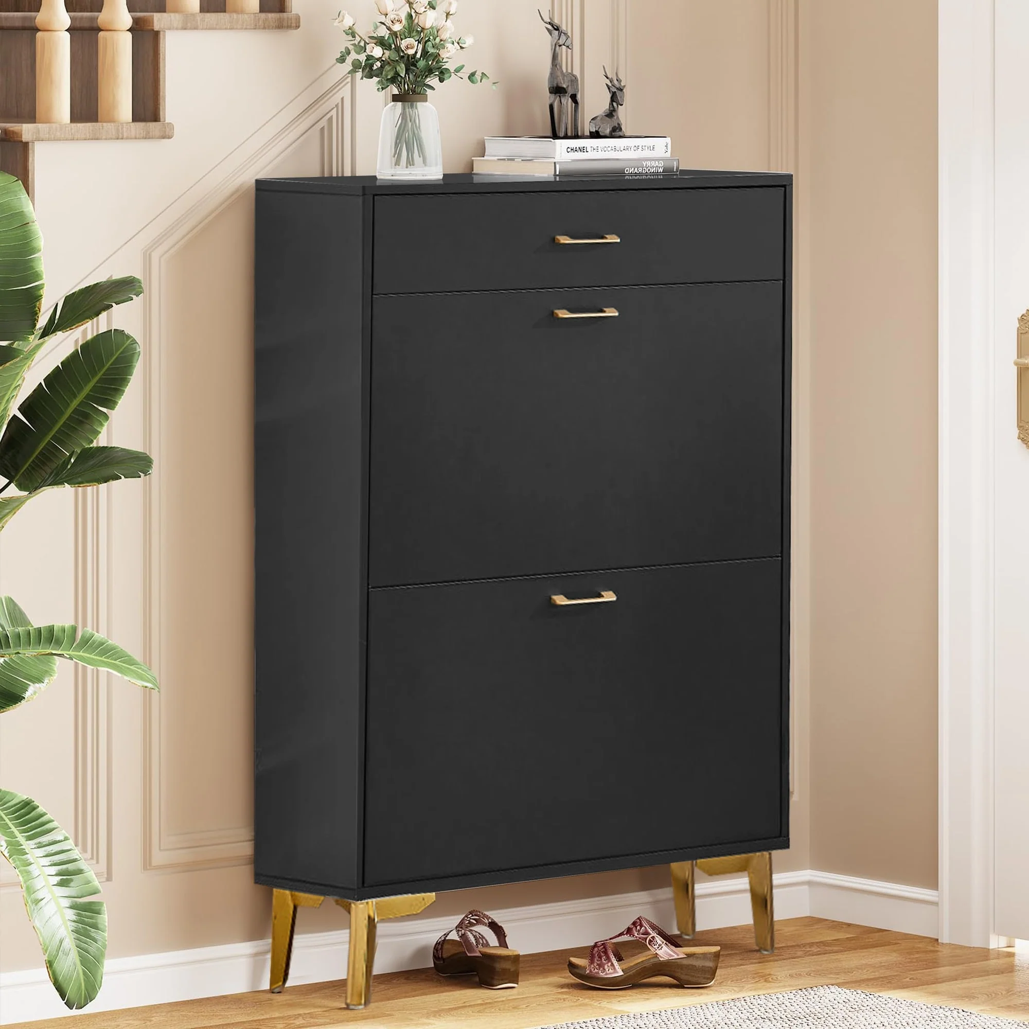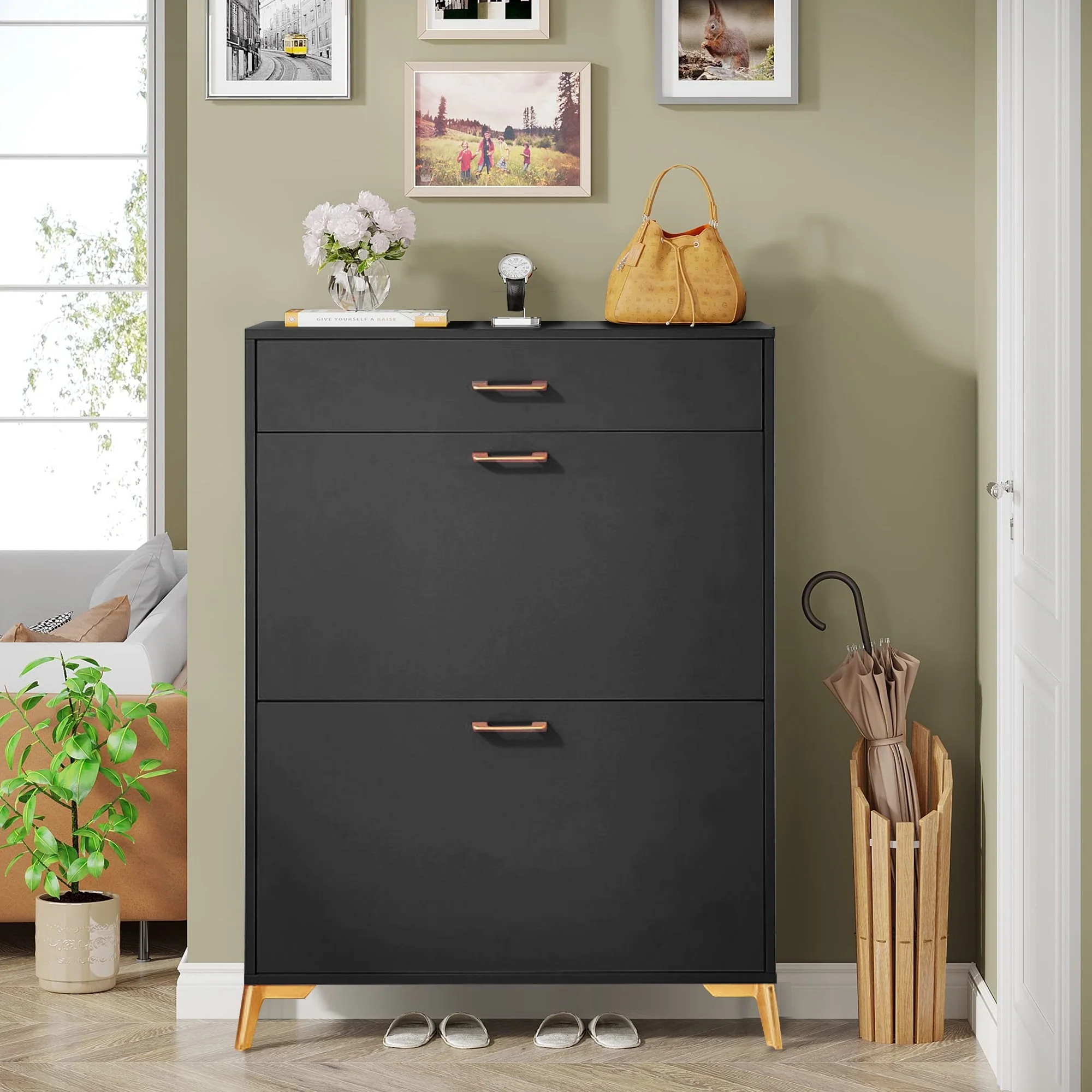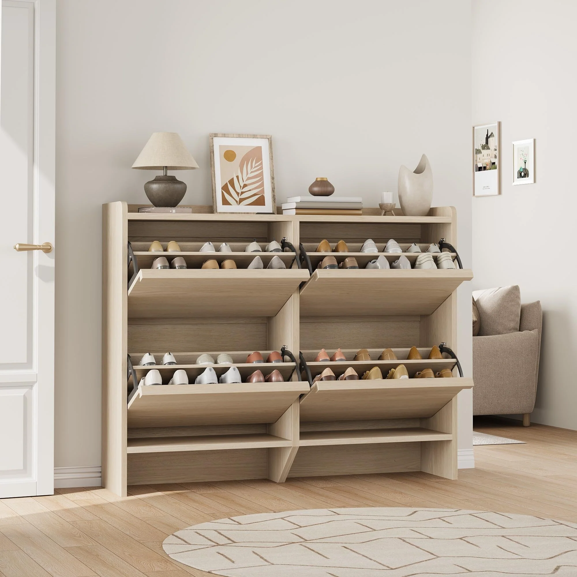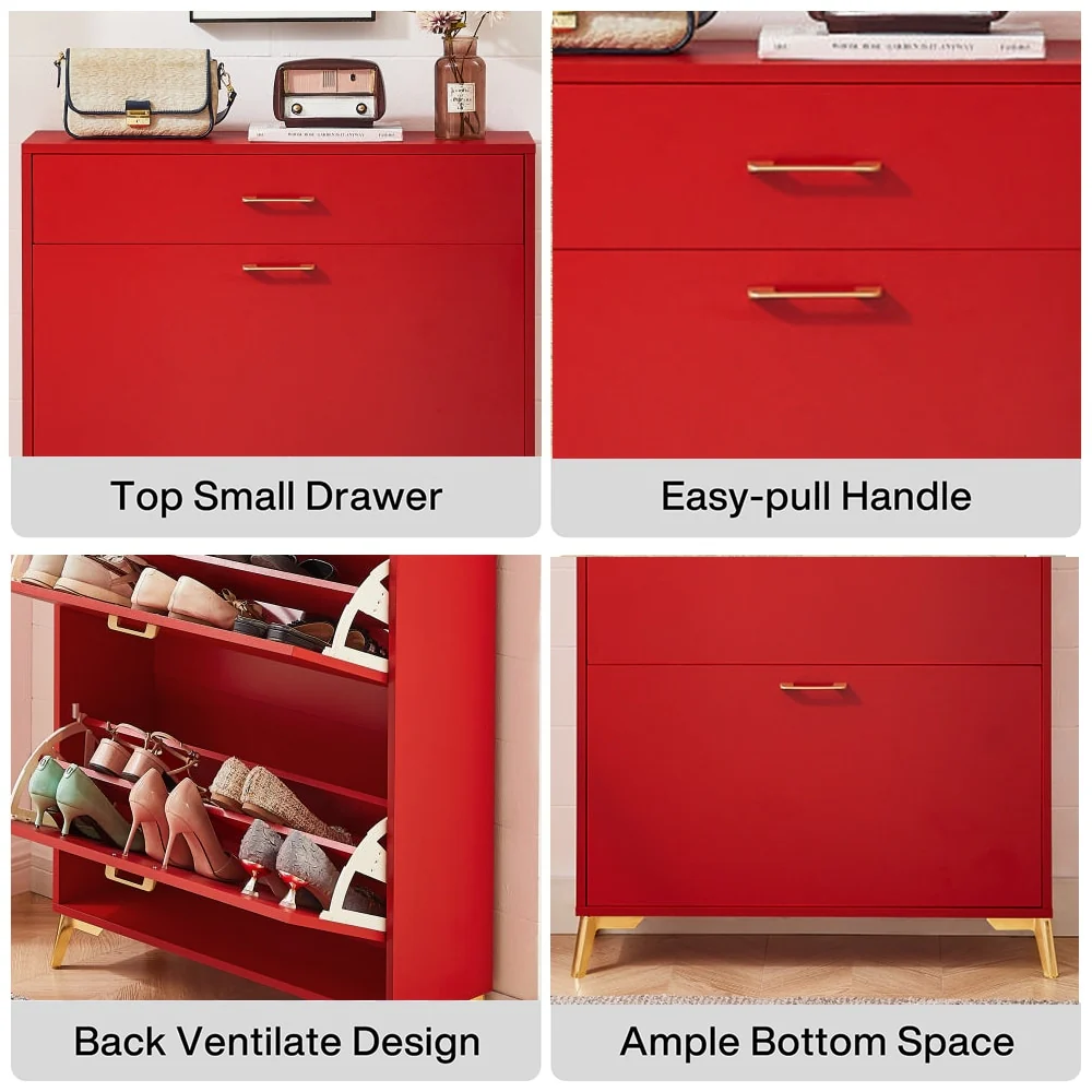 Fluted Shoe Cabinet for Entryway, Slim Shoe Storage Cabinet with 2 Flip Drawer and Solid Wood Legs Narrow Shoe Organizer