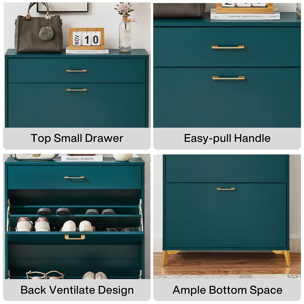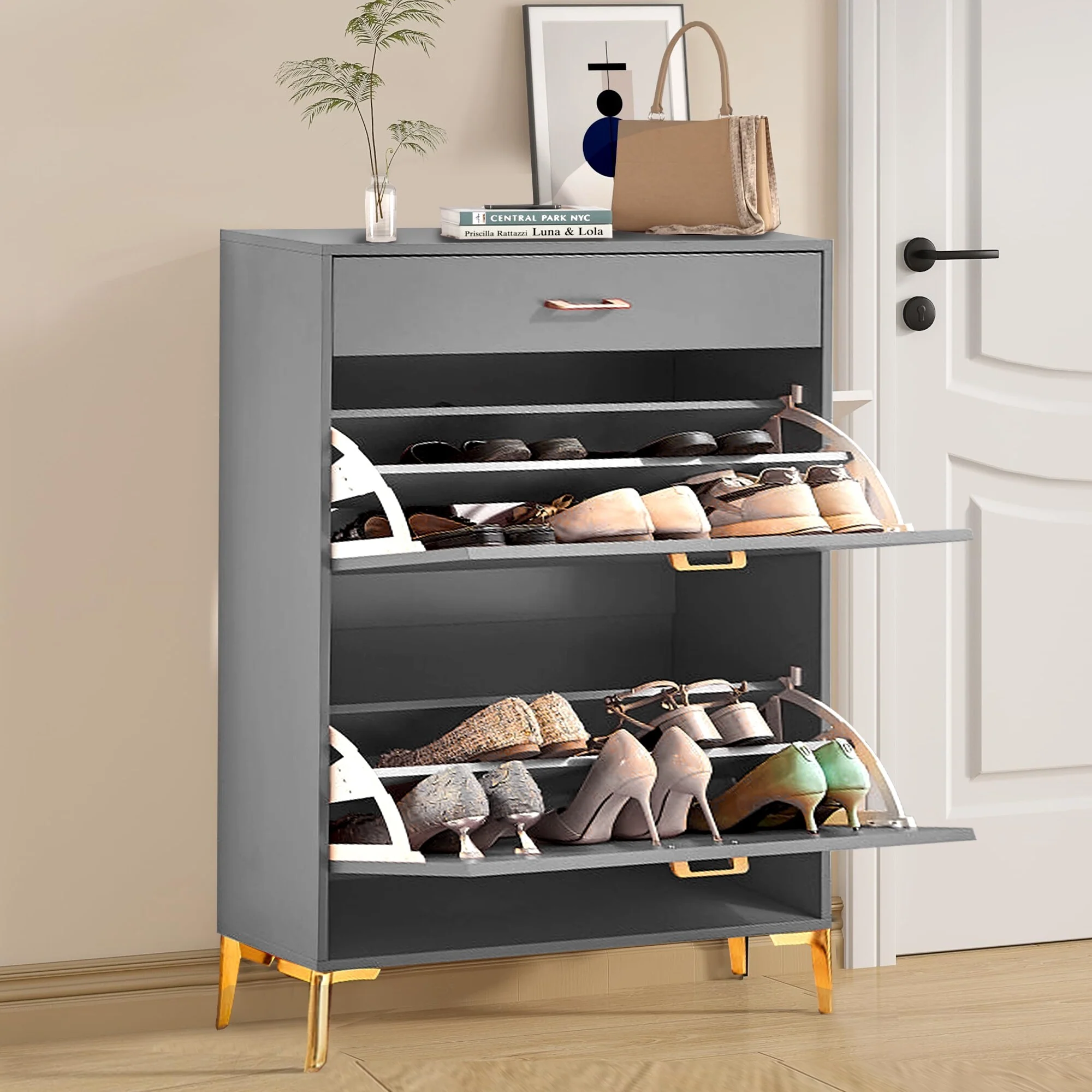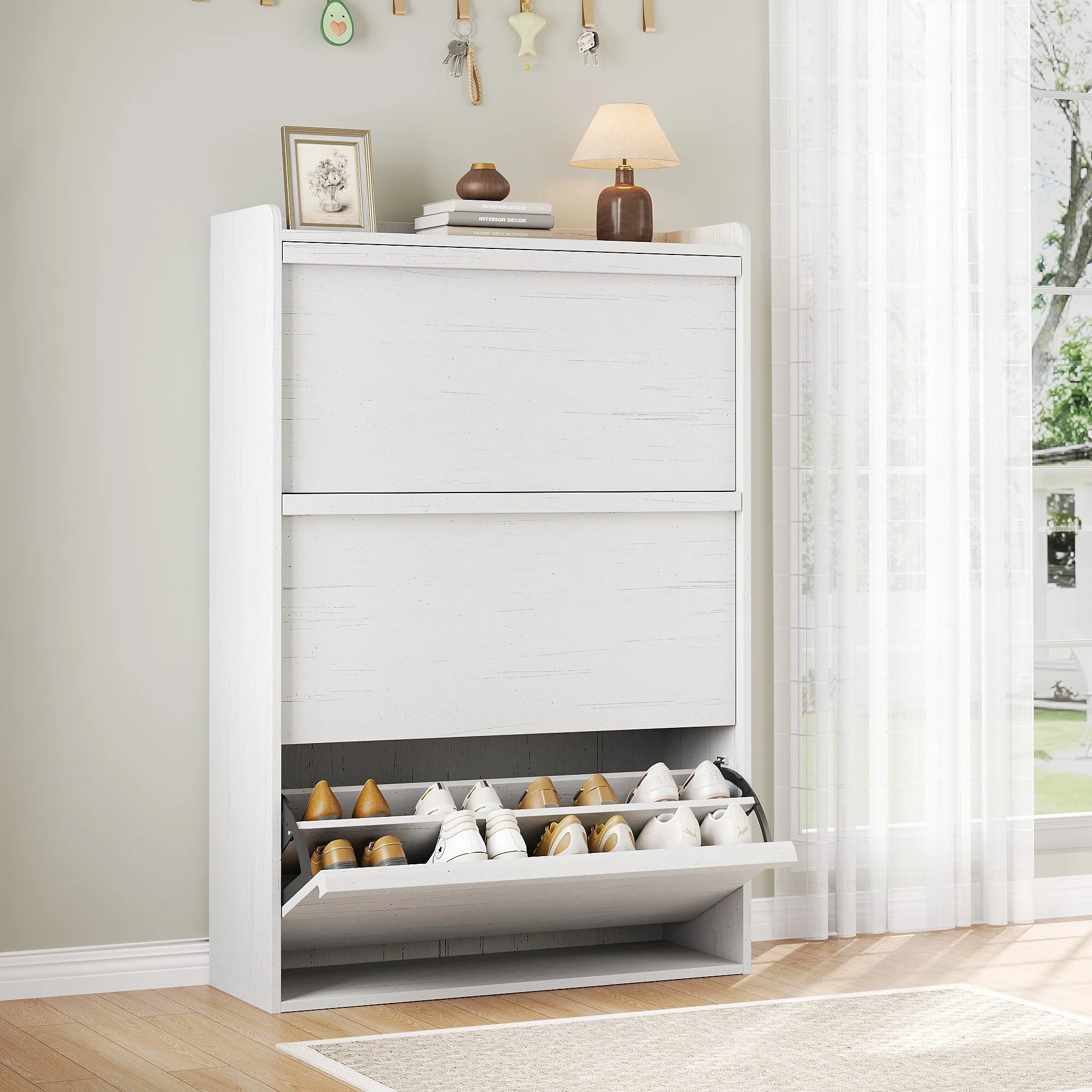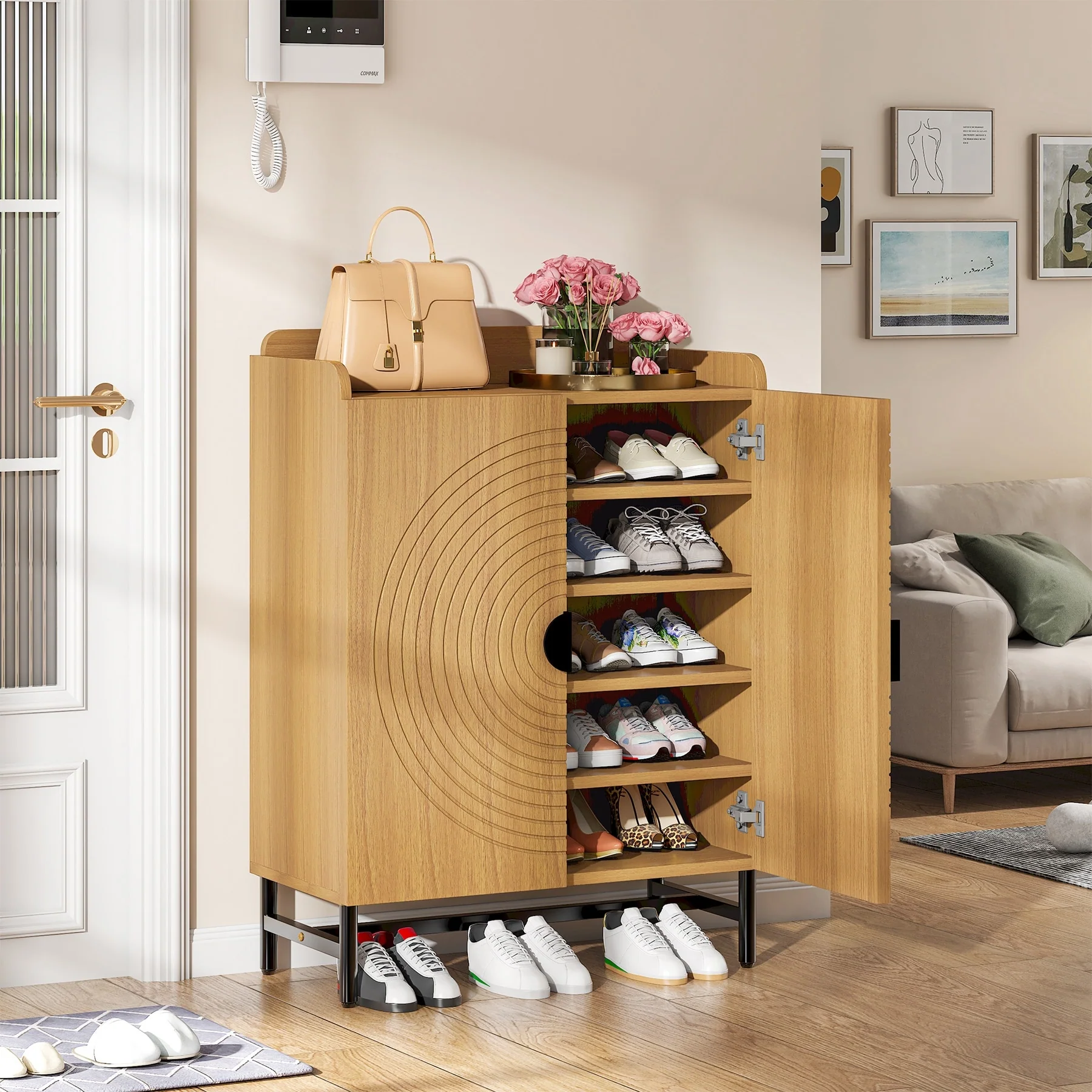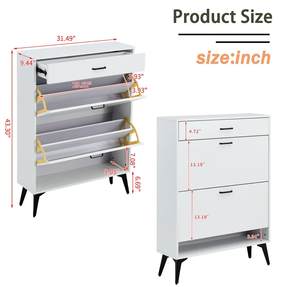 Fluted Shoe Cabinet for Entryway, Slim Shoe Storage Cabinet with 2 Flip Drawer and Solid Wood Legs Narrow Shoe Organizer