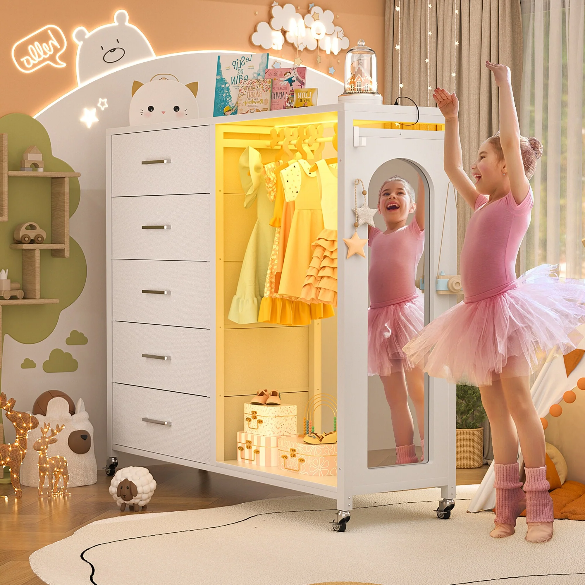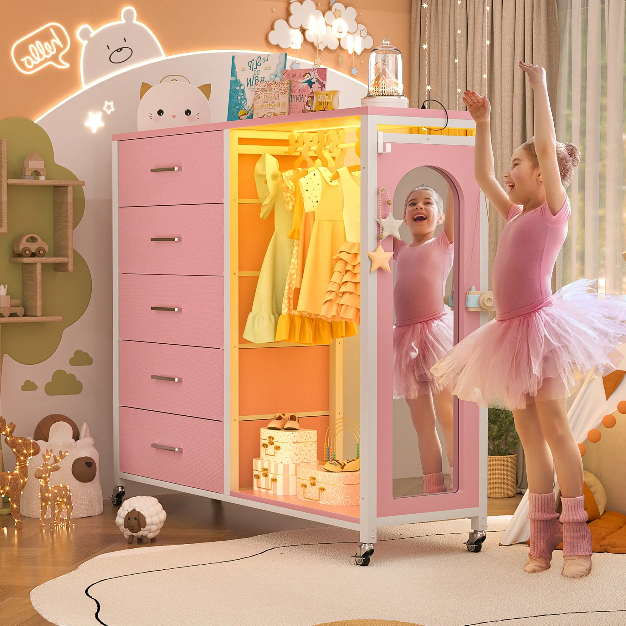 Kid's Closet Organizer with Fabric Drawers and Mirror, Rolling Dresser and Chest with Charge Station