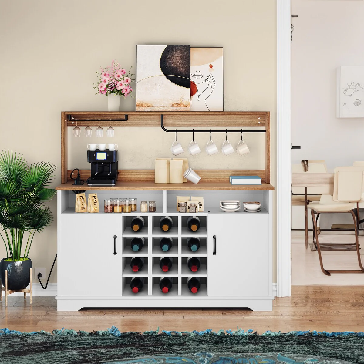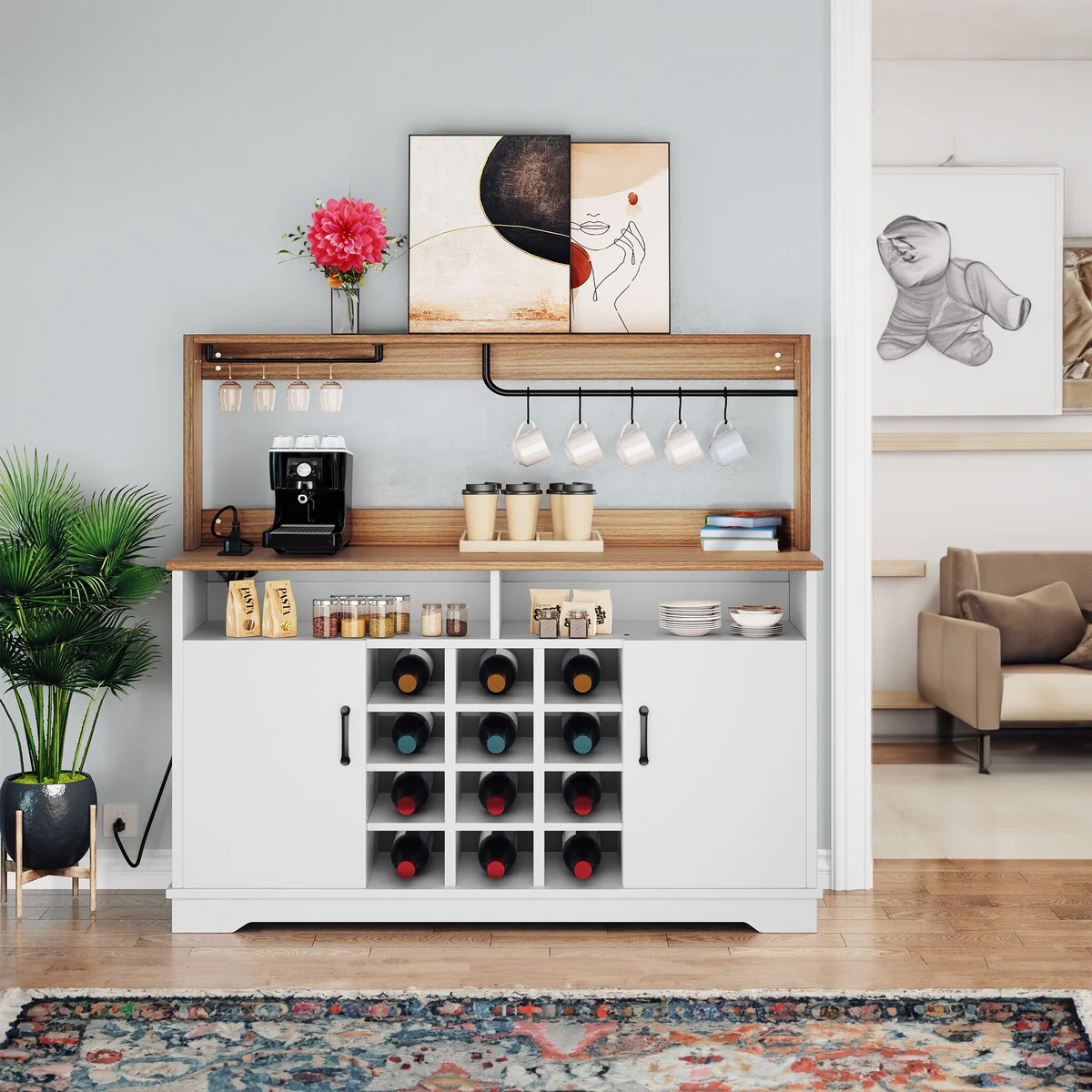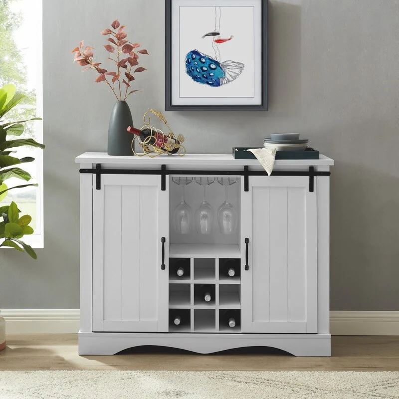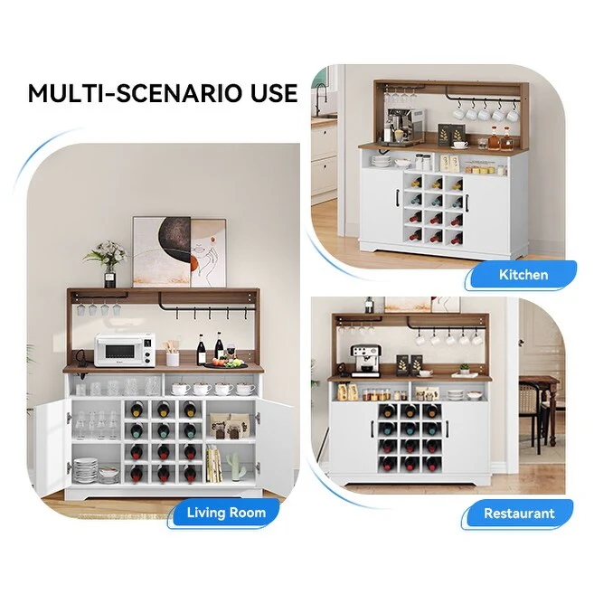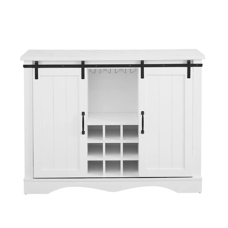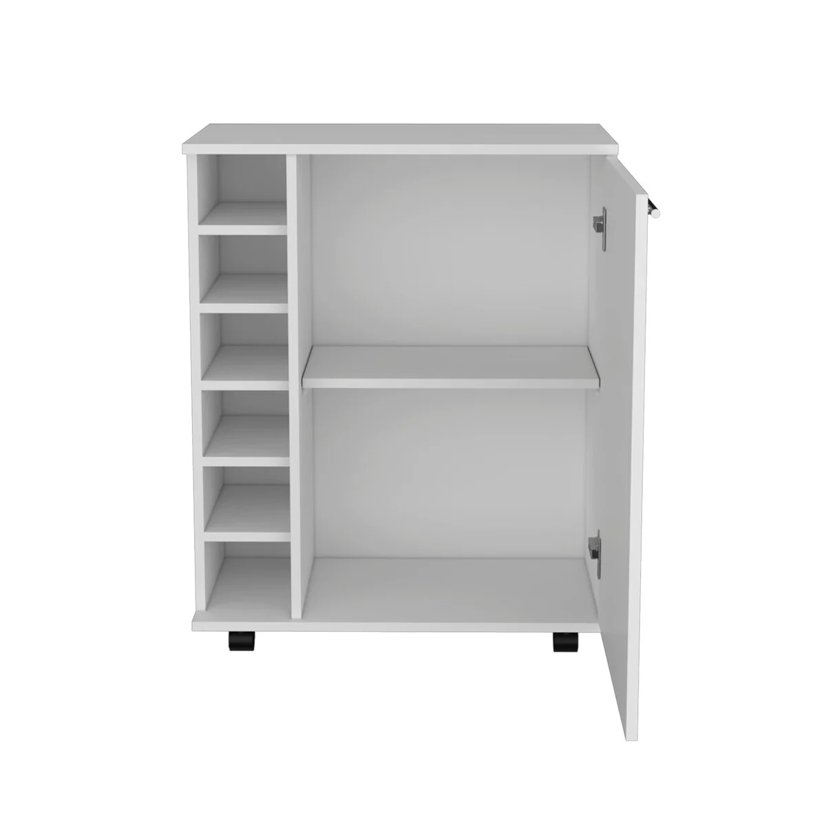 32" H white bar -coffee cart,living room cabinet storage with 4 wheels, with 6 bottle racks, a central shelf covered by 1 door