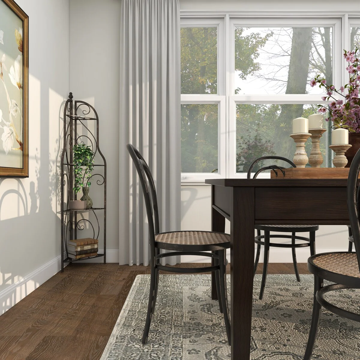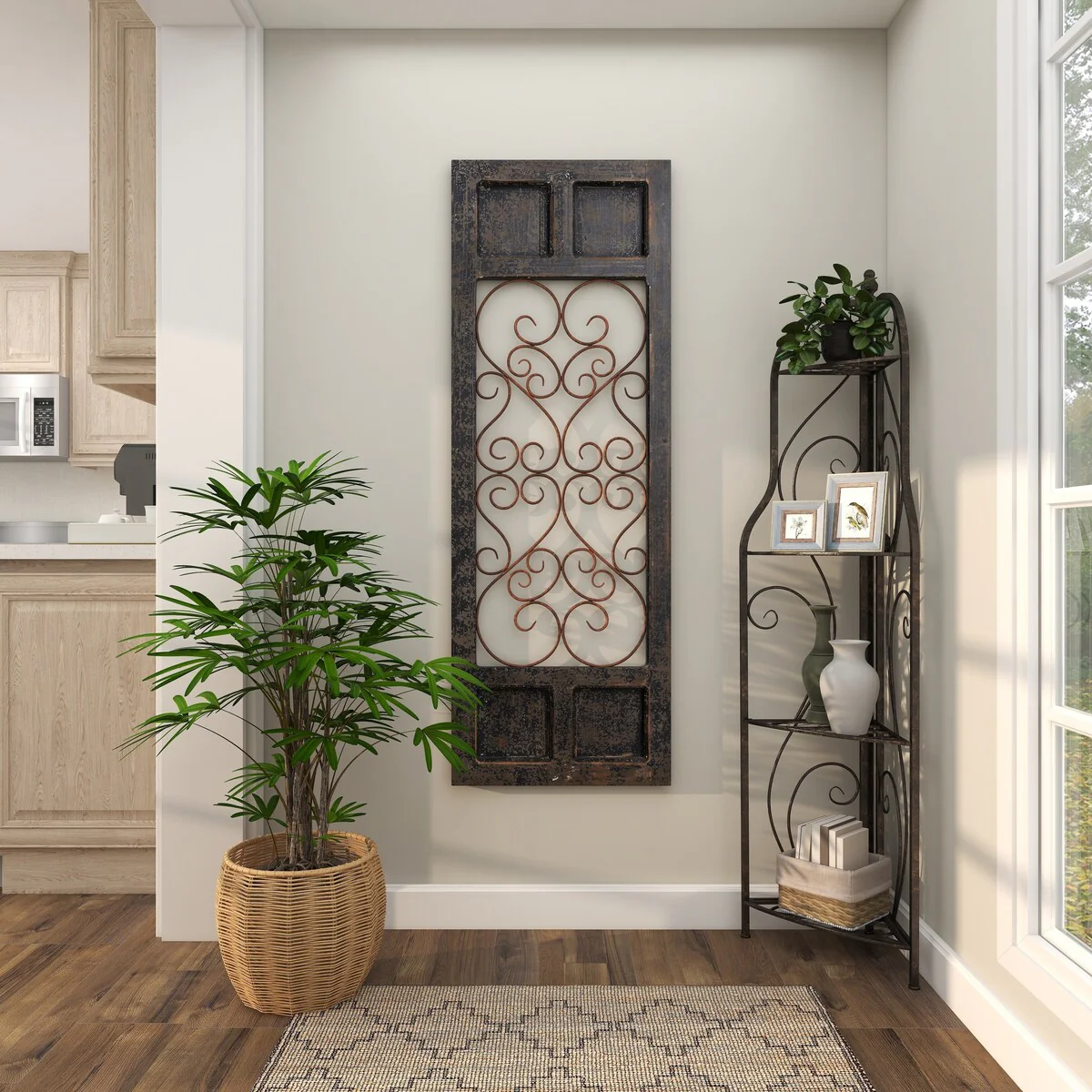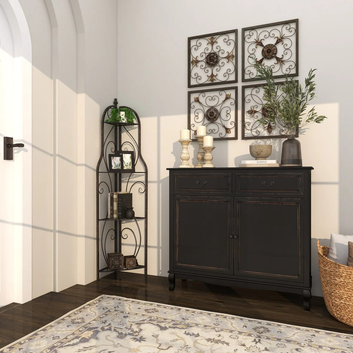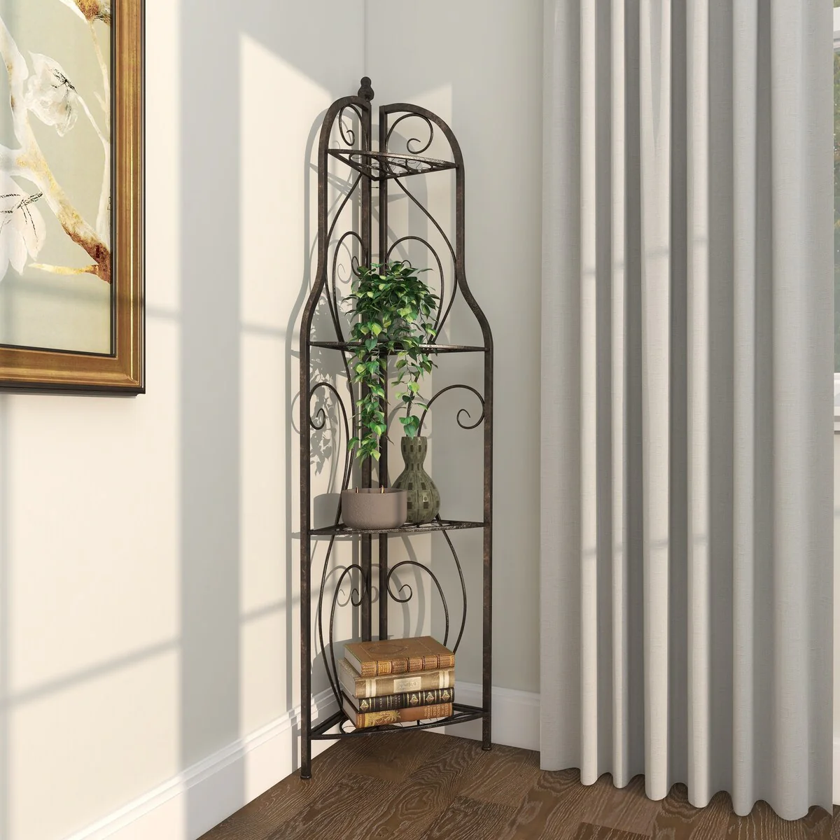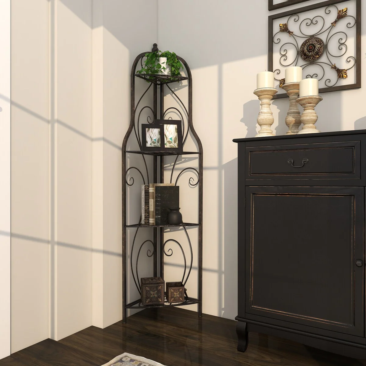 Metal Scroll Indoor Outdoor Arched Tall Folding Corner 4 Shelf Bakers Rack - Black - Roche River Decor