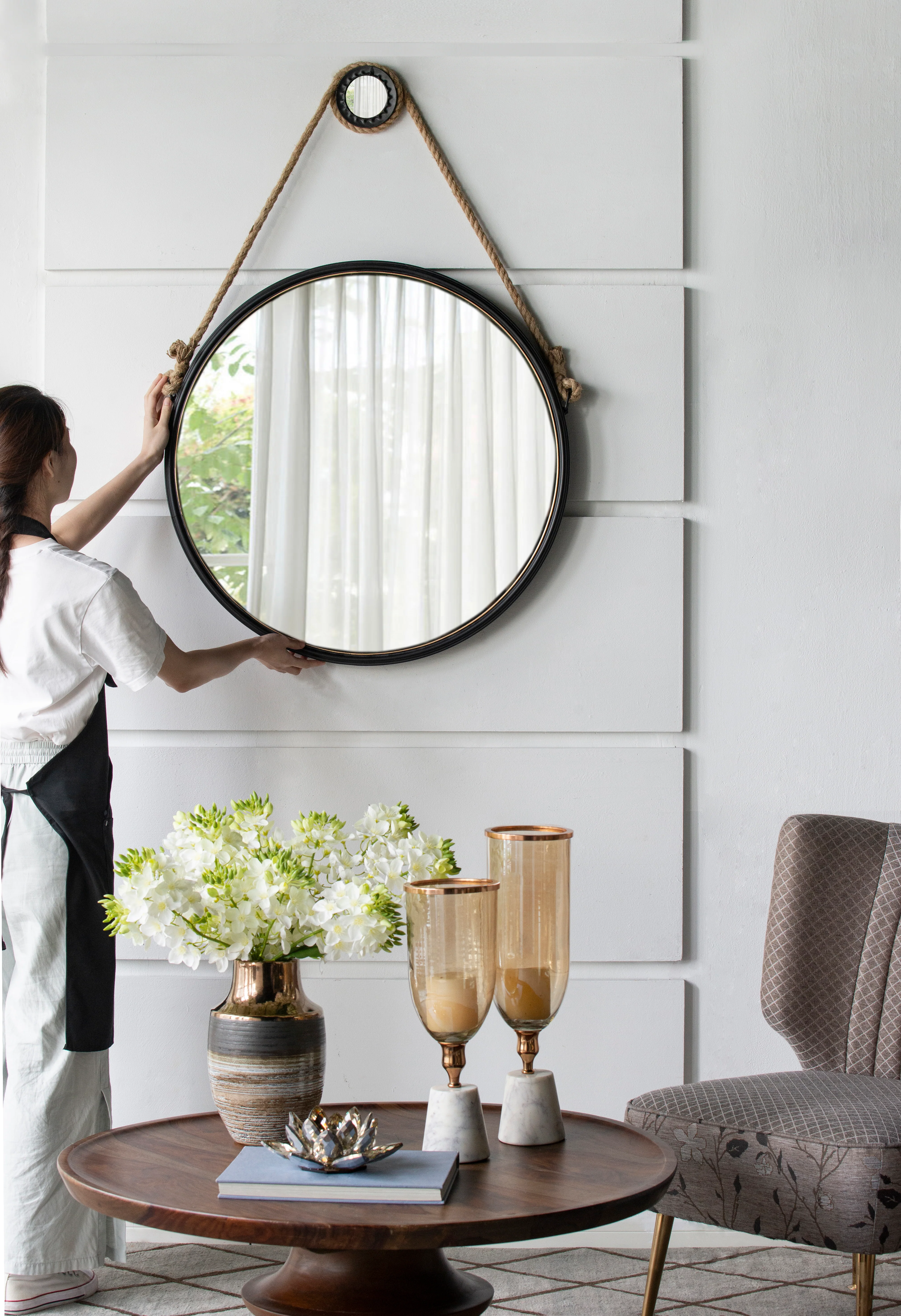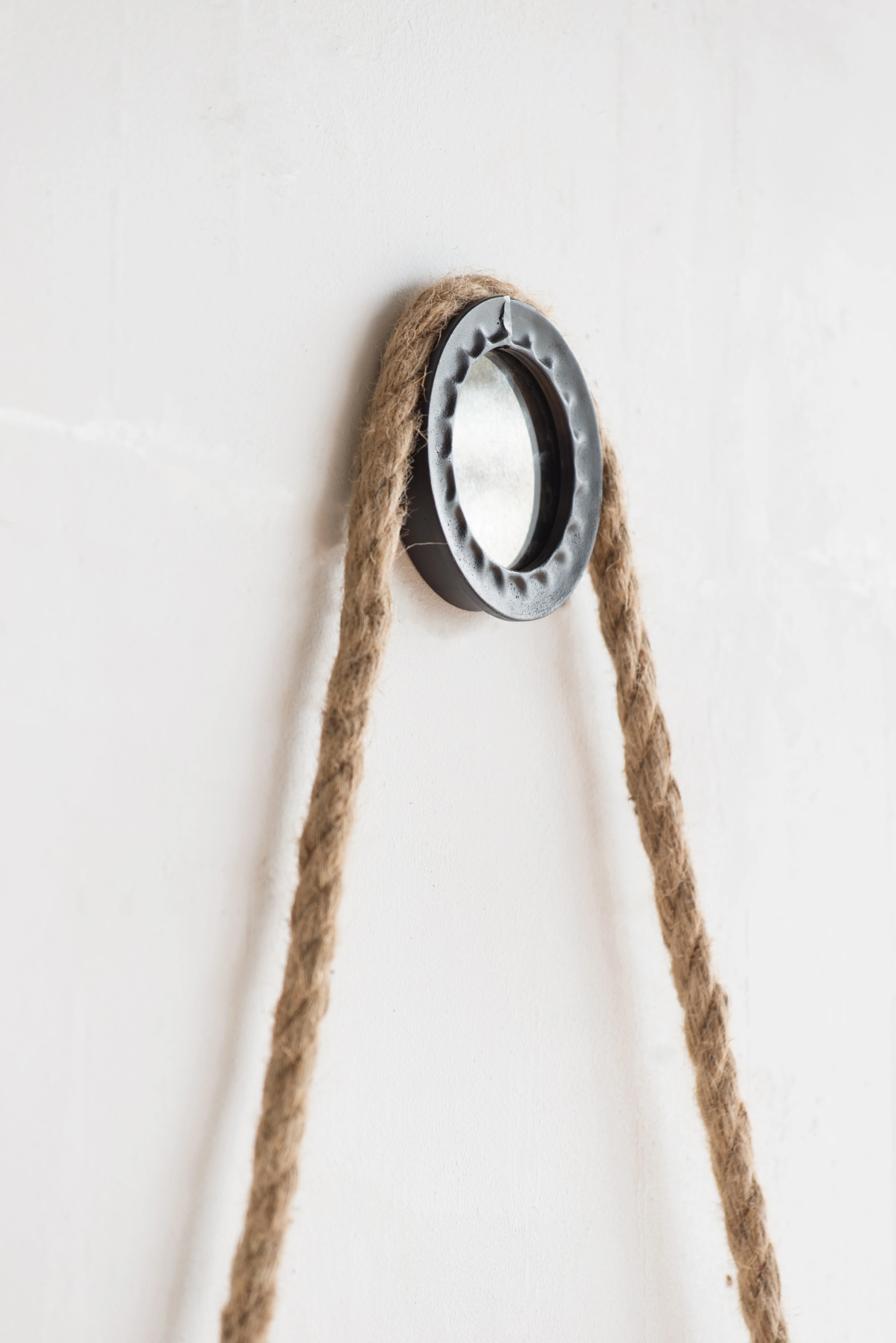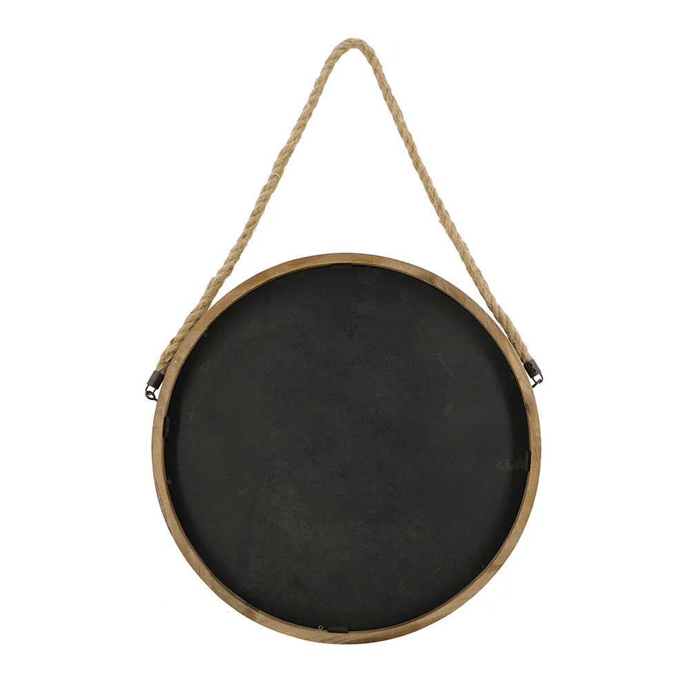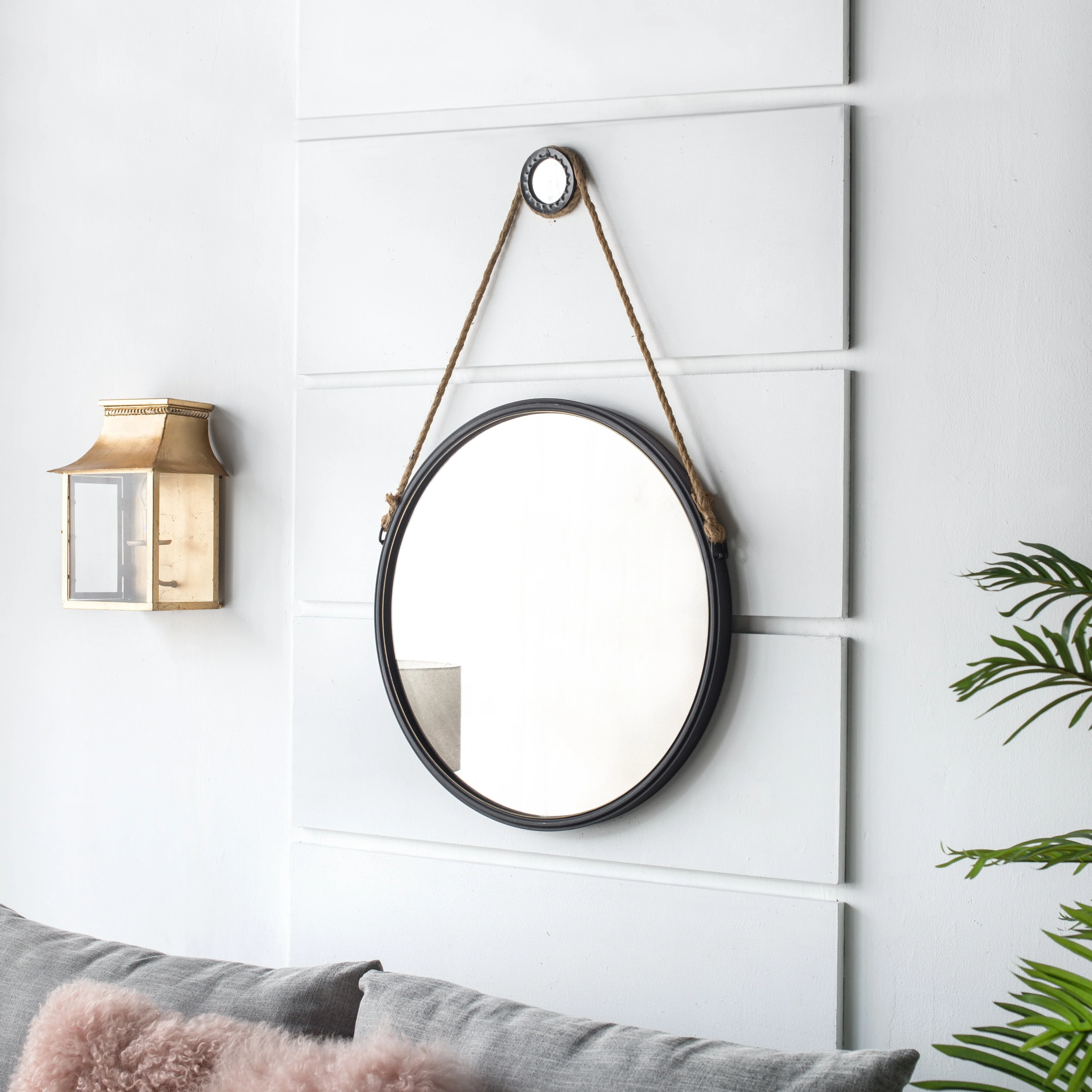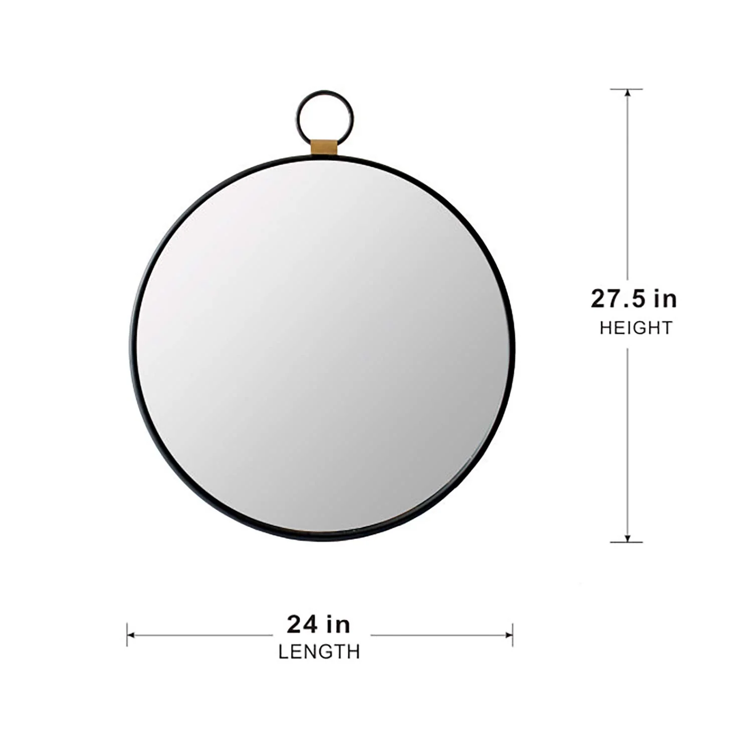 29.5 Rope Strap Hanging Round Mirror with Metal Framed, Black