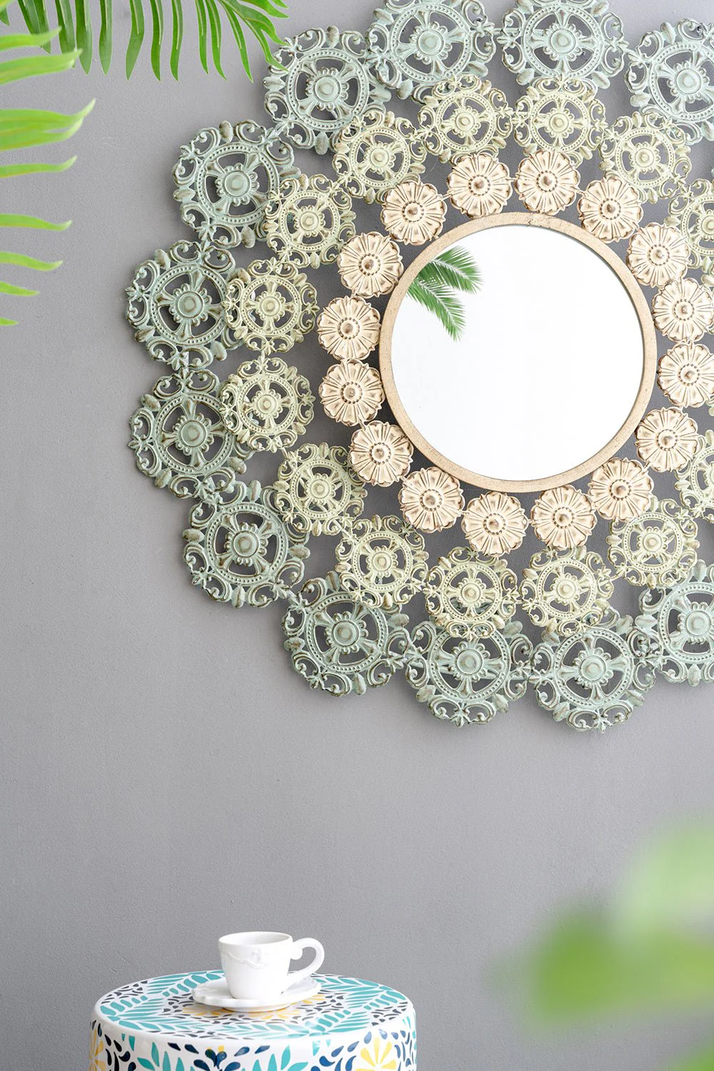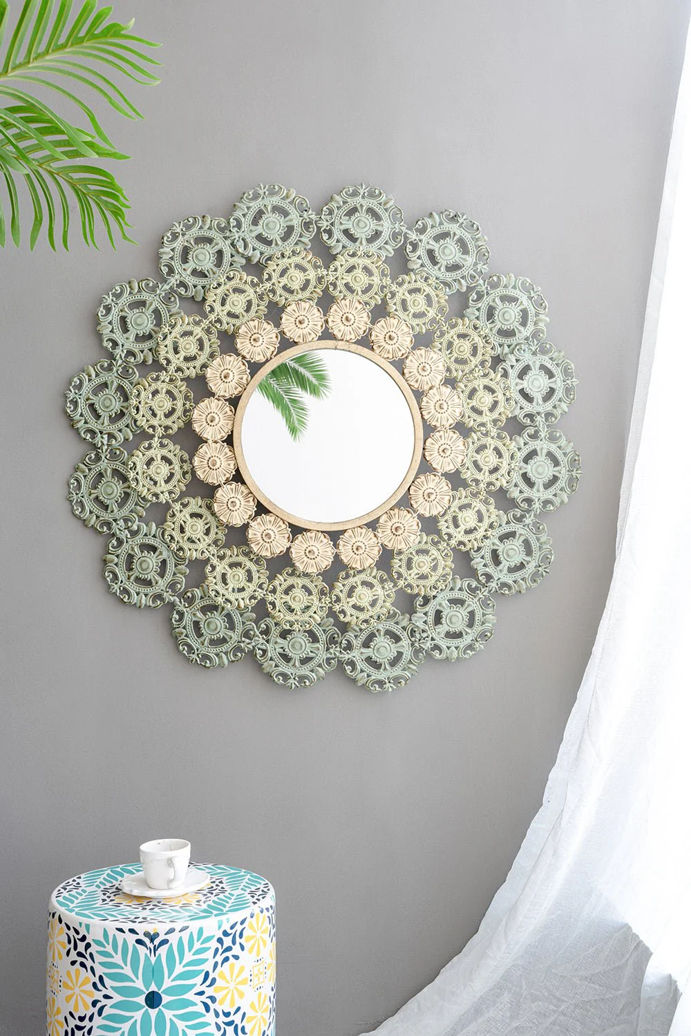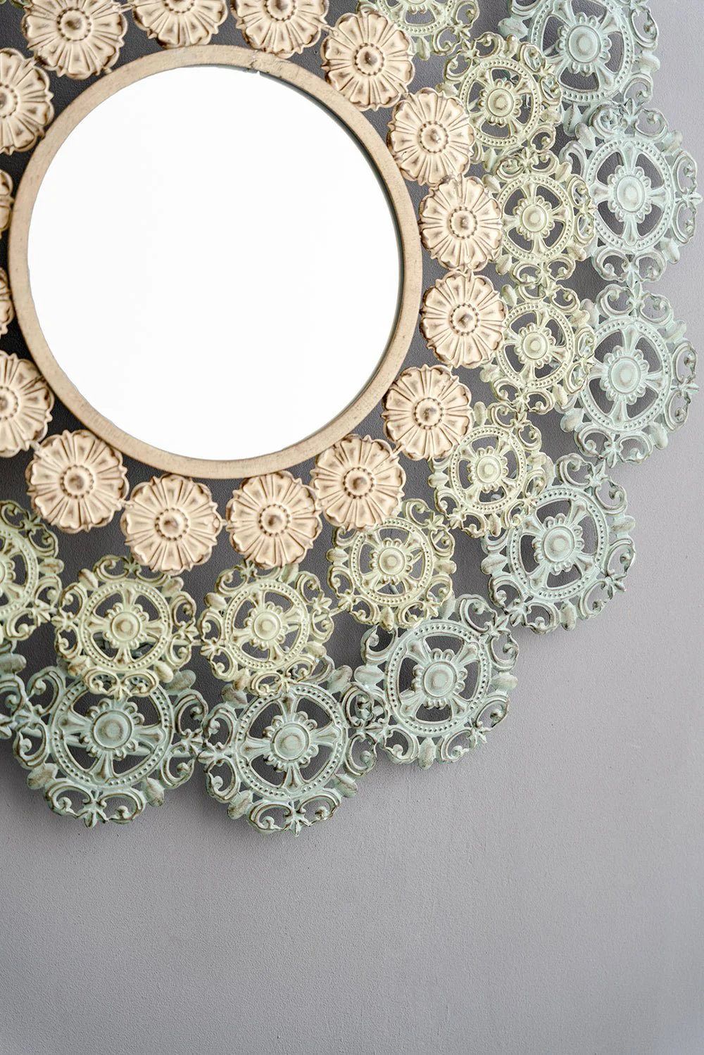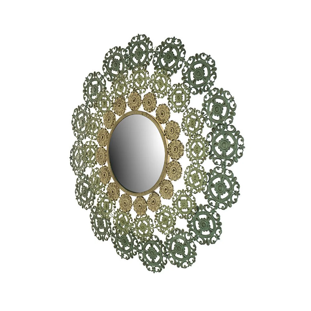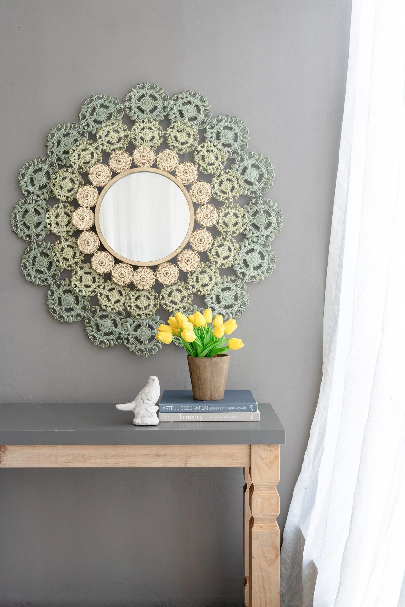 Round Wall Mirror with Floral Accents and Iron Scrollwork