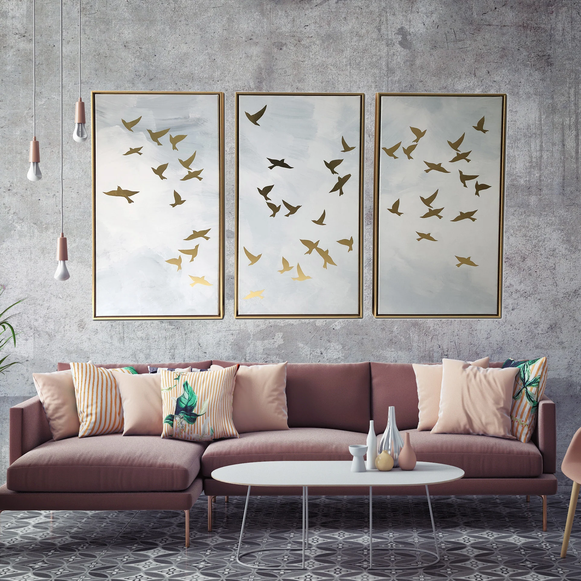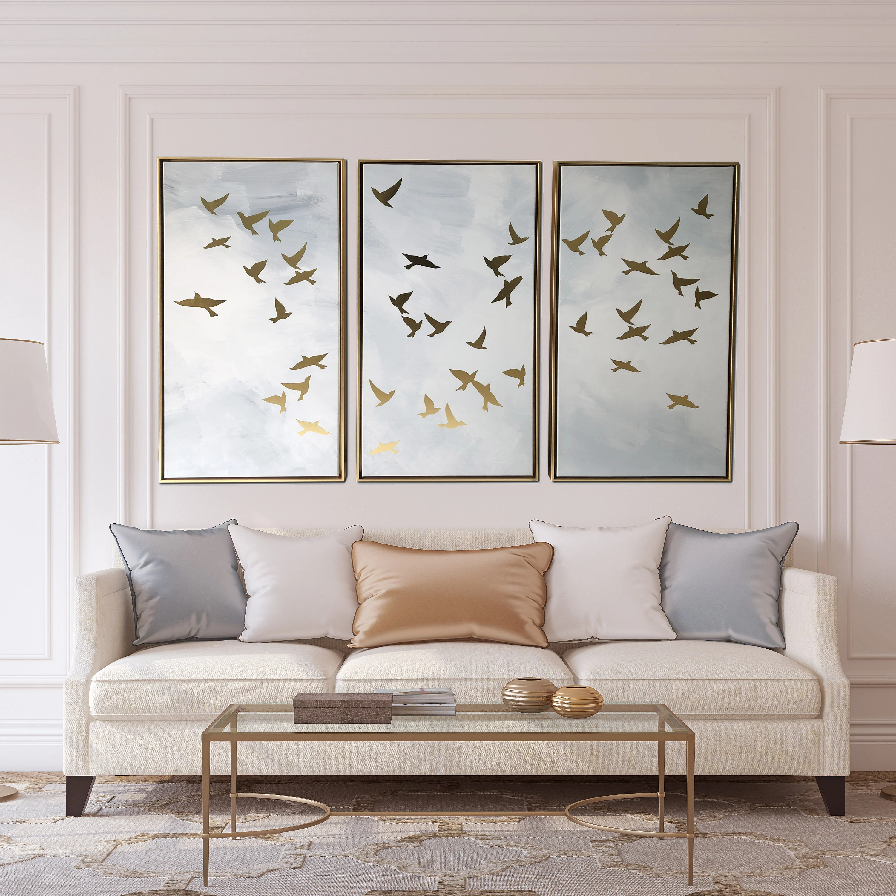 Golden Birds 3-Piece Set Print on Gold Floating Framed Canvas Wall Art, 48x30